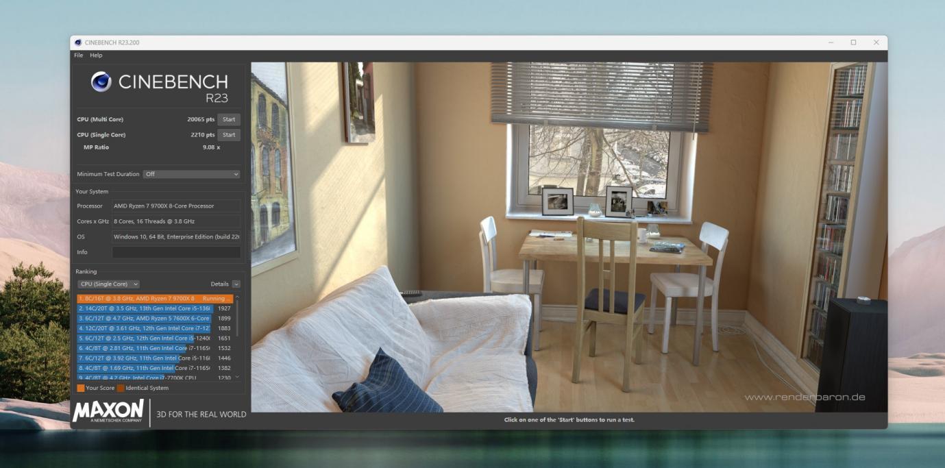 CINBENCH R23测试,多核20065,之前是19420,单核2210,之前是2182,均有所提升。