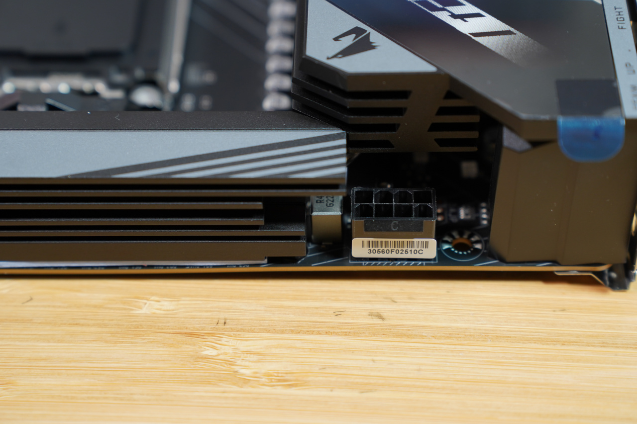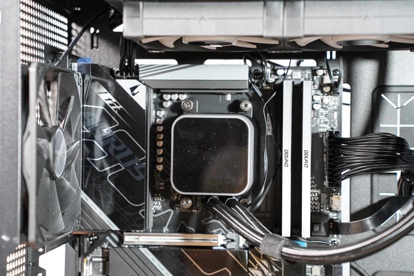 这款技嘉主板的设计就很合理,显卡插槽和CPU槽之间有充足的距离,无论是大型风冷散热器还是水管在下的水冷散热器,都不会影响到显卡的安装。从正面的视角可以看出,水管距离显卡还有很多距离。