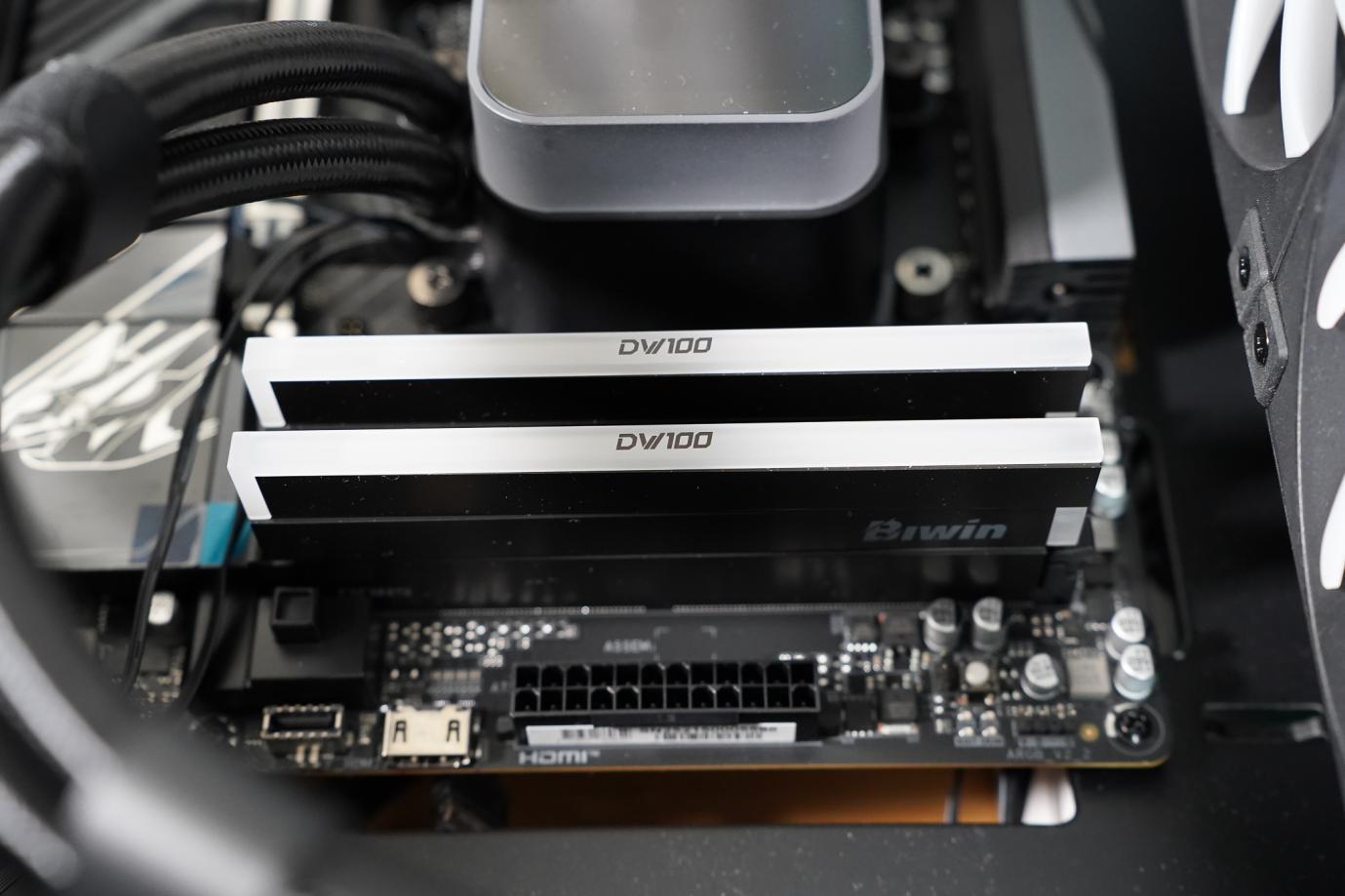 然后安装内存,水冷水管在下的散热器,内存的安装就看起来比较轻松,不会拥挤。
