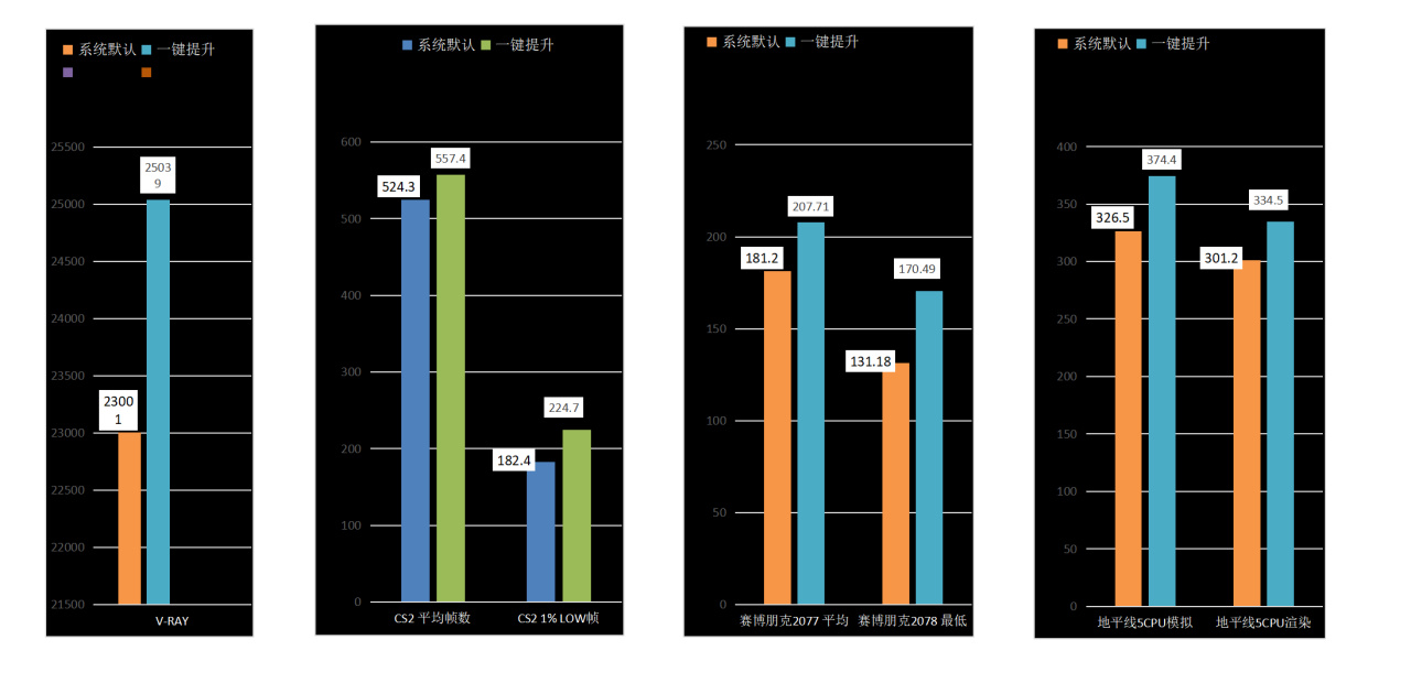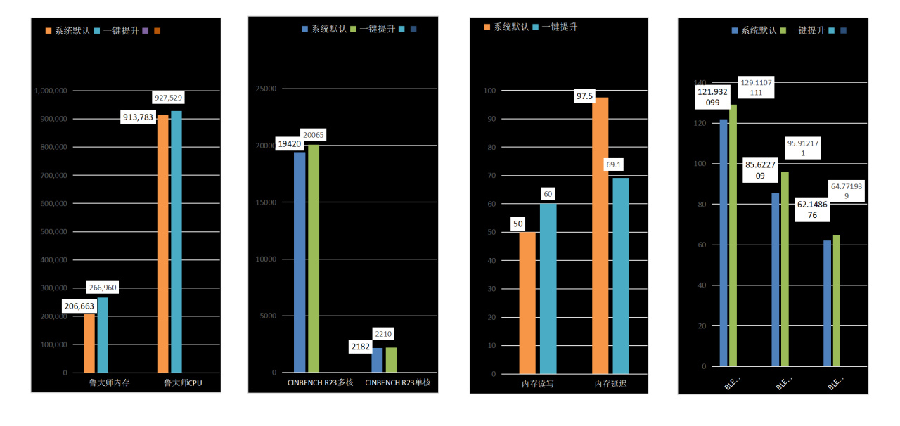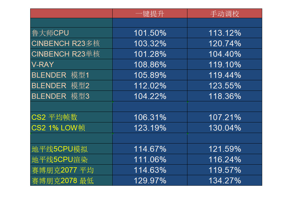 将上面的测试做了汇总表格,看看相对于默认配置,各个测试和游戏的提升幅度。可以清楚的看出都明显有了提升。而有趣的是,在一键提升的配置下,虽然性能跑分测试模式提升的幅度似乎不大,但是对于游戏帧数的提升却是十分明显。而继续手动调校后,虽然性能跑分提升了不少,但游戏提升的幅度,没有性能得分提升的幅度大。这说明这款主板的一键黑科技功能,对于游戏的提升十分明显。