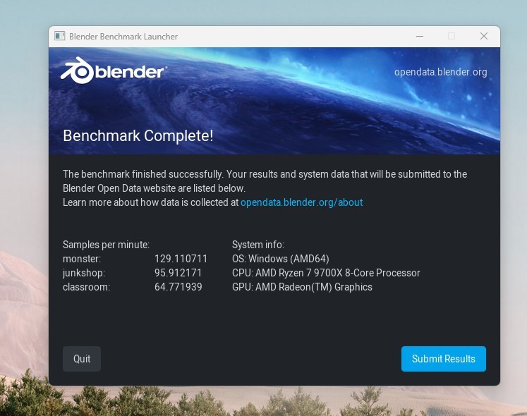 生产力BLENDER测试,monster场景129.1107111,之前是121.932099;junkshop场景是95.912171,之前是85.622709;classroom场景64.771939,之前是62.148676。三个场景均有提升,说明效果明显。