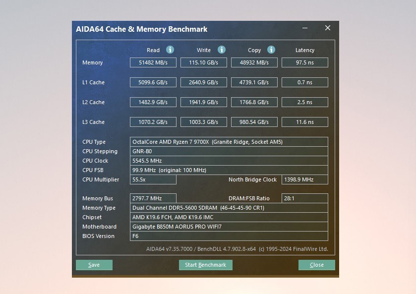 AIDA64 内存测试,读取速度在50000MB/s左右,延迟97.5ns。