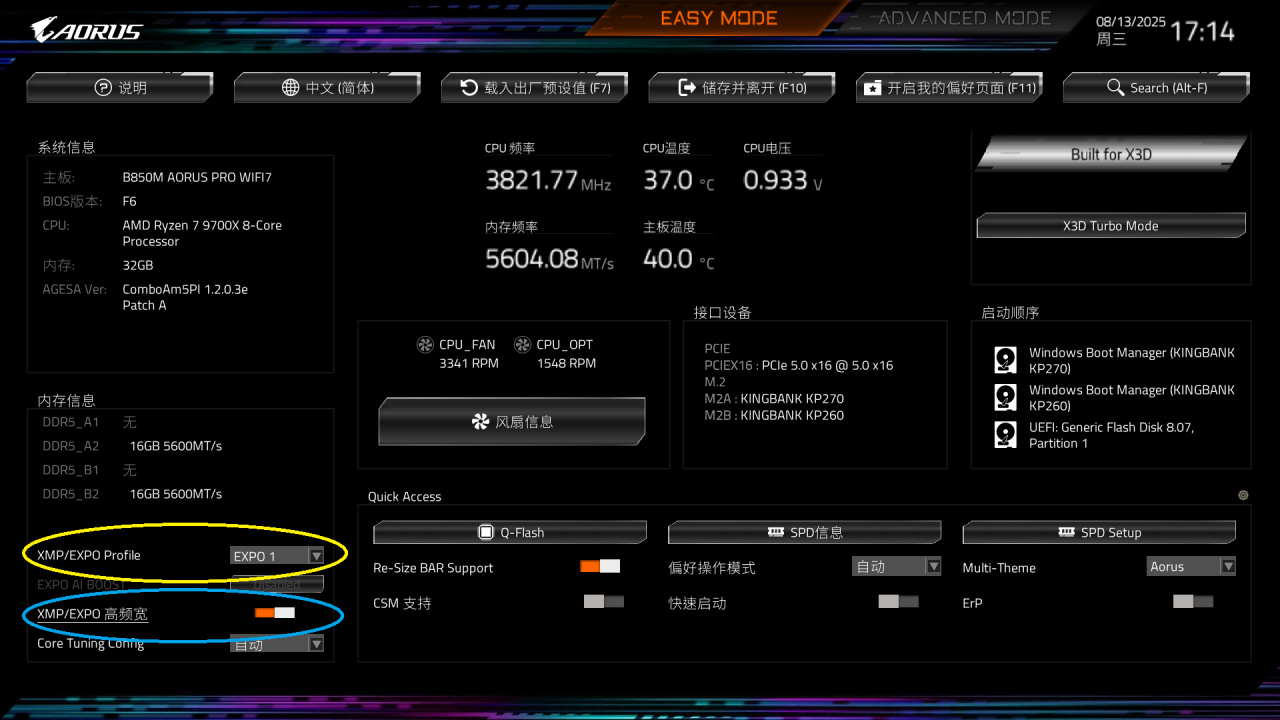 我们首先在这个页面,选择一键启用EXPO,就是左下角黄色圈里的。然后启用技嘉黑科技高频宽,就是蓝色框里的。