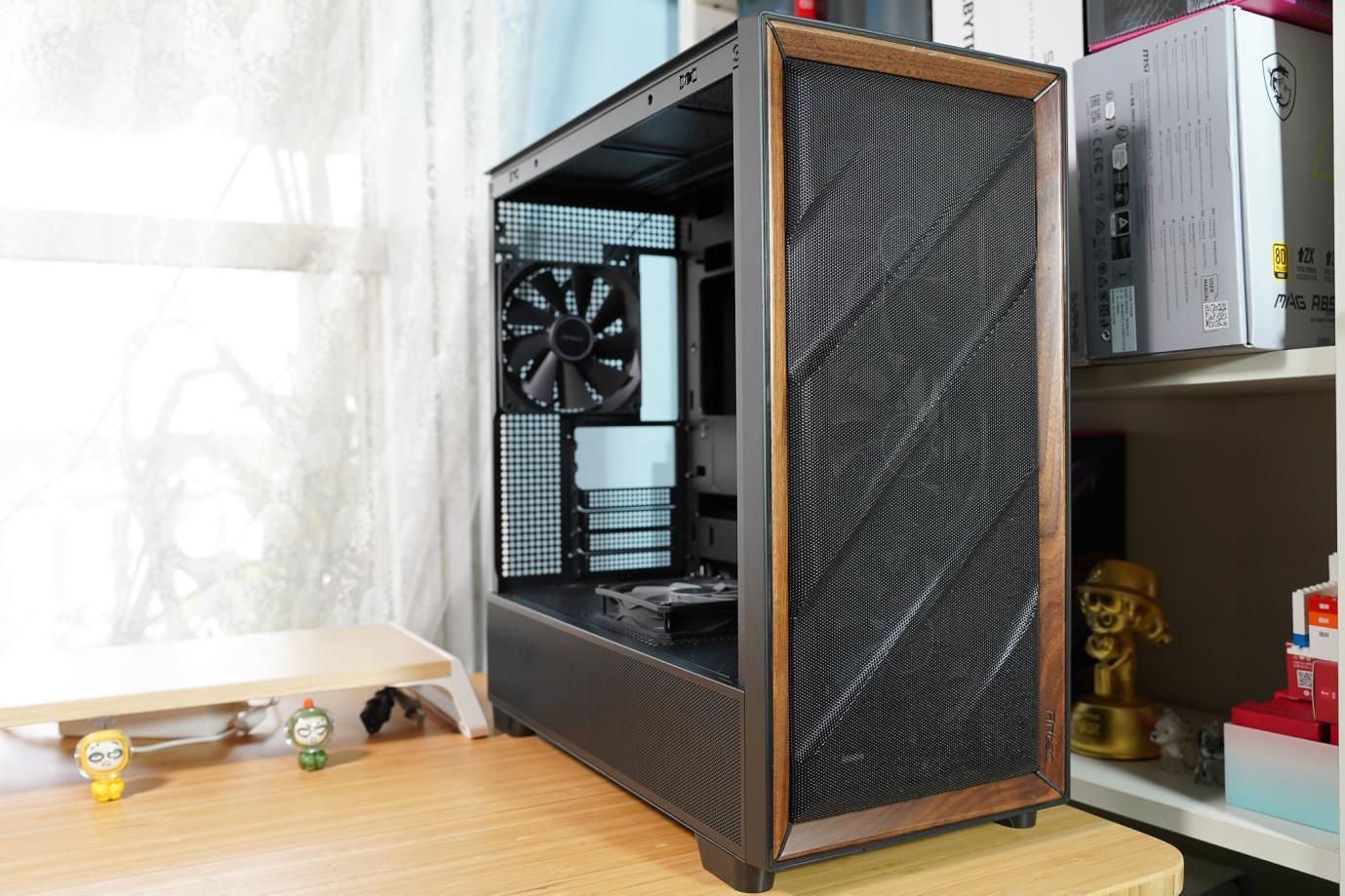 这么好的酷黑主板,配备一个黑色的机箱,选择了安钛克的FLUX机箱。这款机箱具有出色的外表,高端大气。全身黑色,正面前面板是波浪形丝网,充满动感。周边是原木框,木框是经过认证的实木胡桃木。左侧面下面一条是丝网通风,上面是块玻璃侧透。