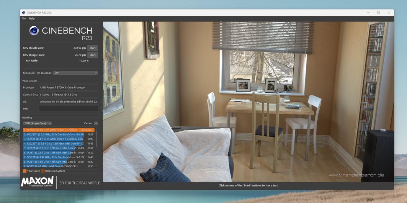 CINBENCH R23,多核23447,单核2278,前值多核20065,单核2210,明显可见系统性能继续有提升。