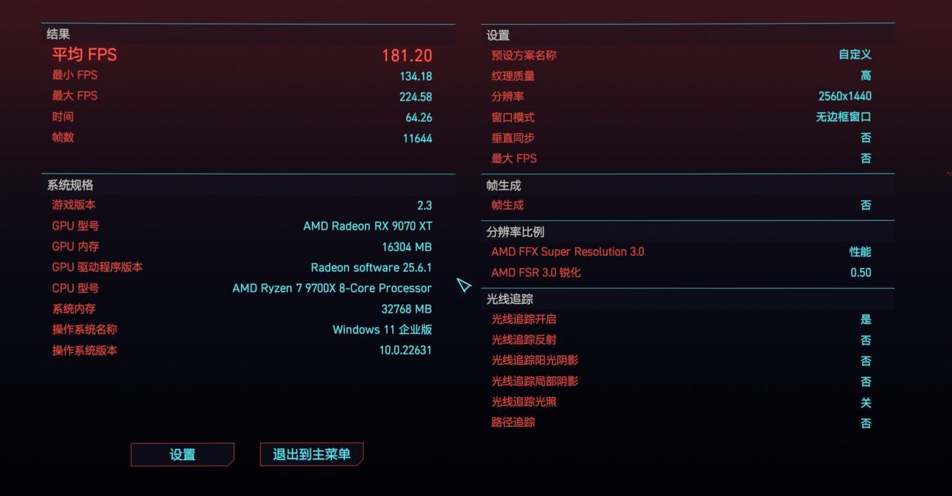 3A大作赛博朋克2077,开启光追平均帧率181.20,最小帧率131.18。