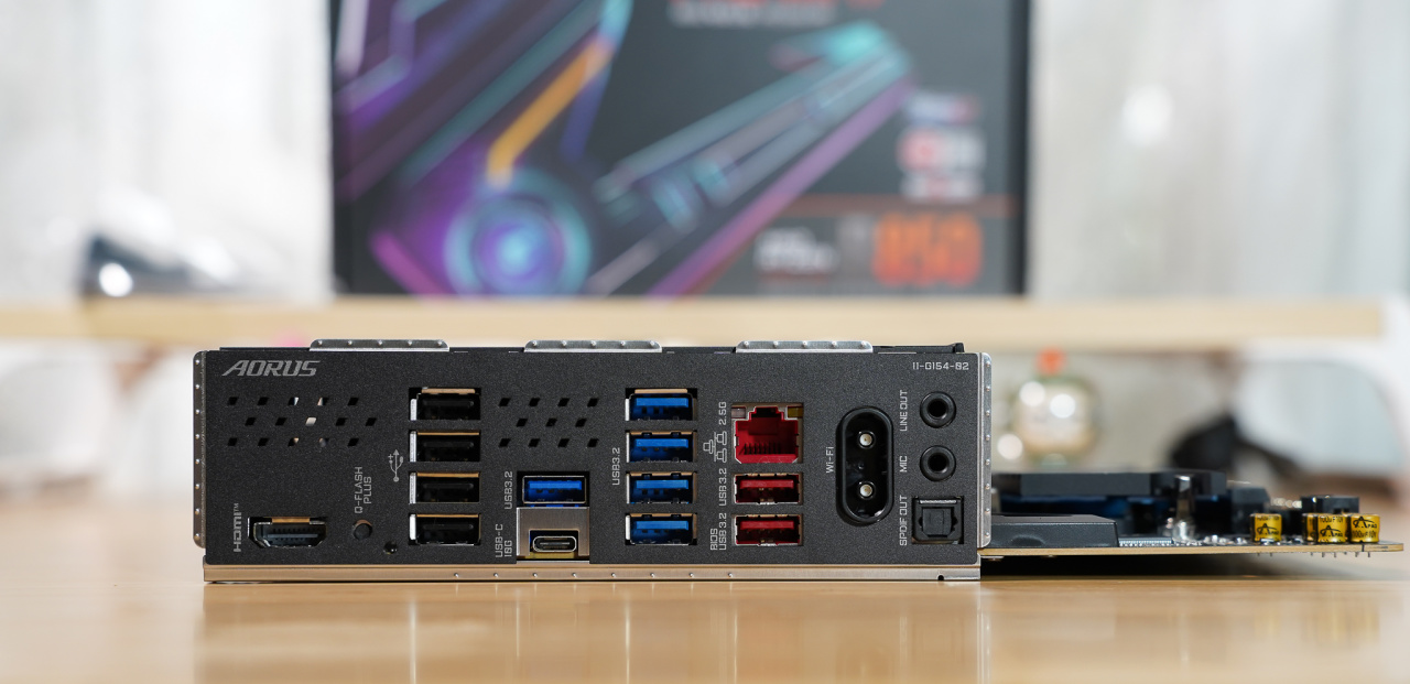 当机箱电源按钮按下,机箱内RGB彩光亮起的时候,我们惊喜的发现,原来这款技嘉主板在一体式IO上面,除了有AORUS的字样外,也有RGB彩光哦,而且是跟随主板的灯光控制方案的。