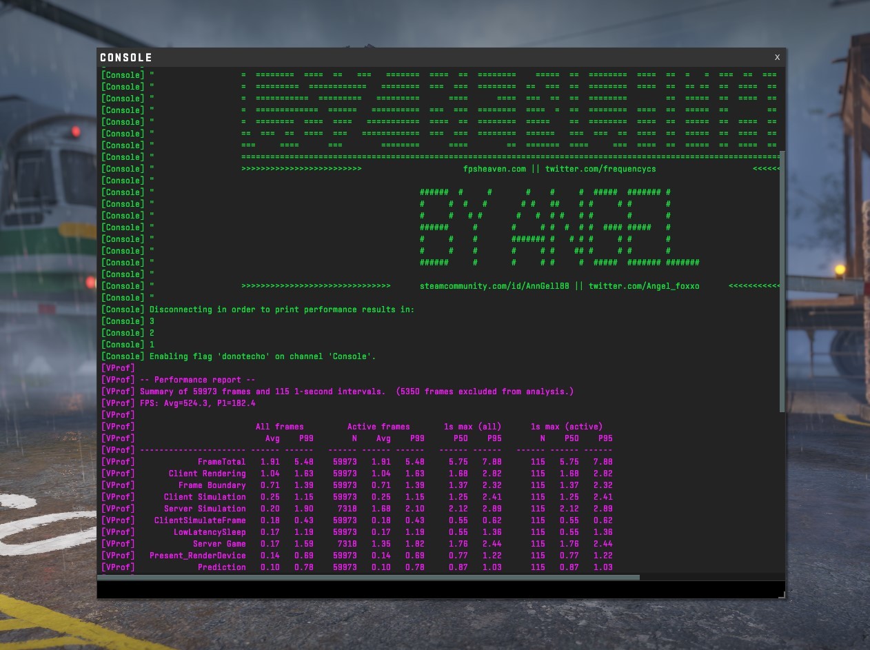 跑一下游戏测试,反恐精英CS2 1080P窗口模式默认高质量画质,平均帧率524.3,1%LOW帧182.4。