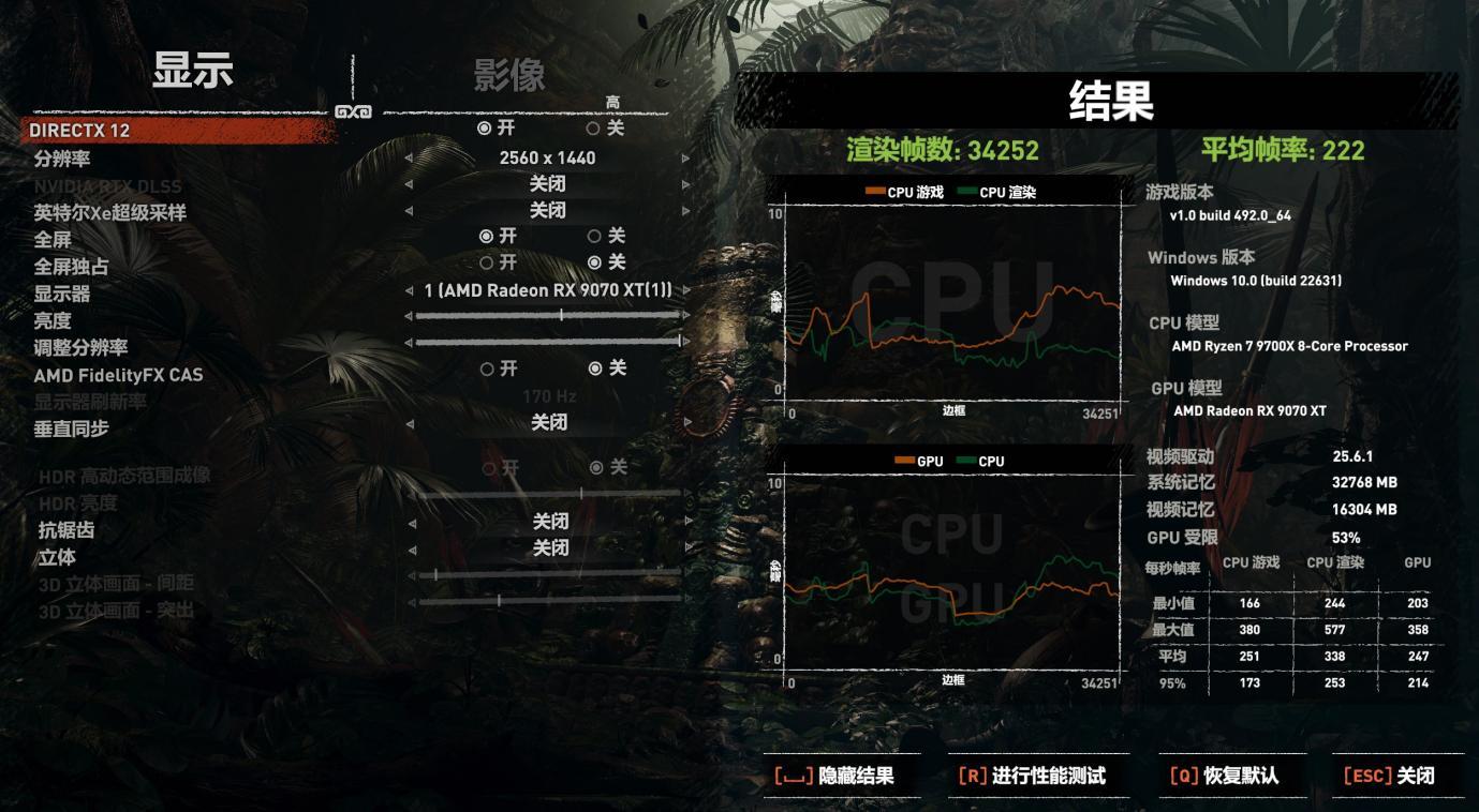 古墓丽影.暗影测试,CPU游戏平均251,CPU渲染平均338。