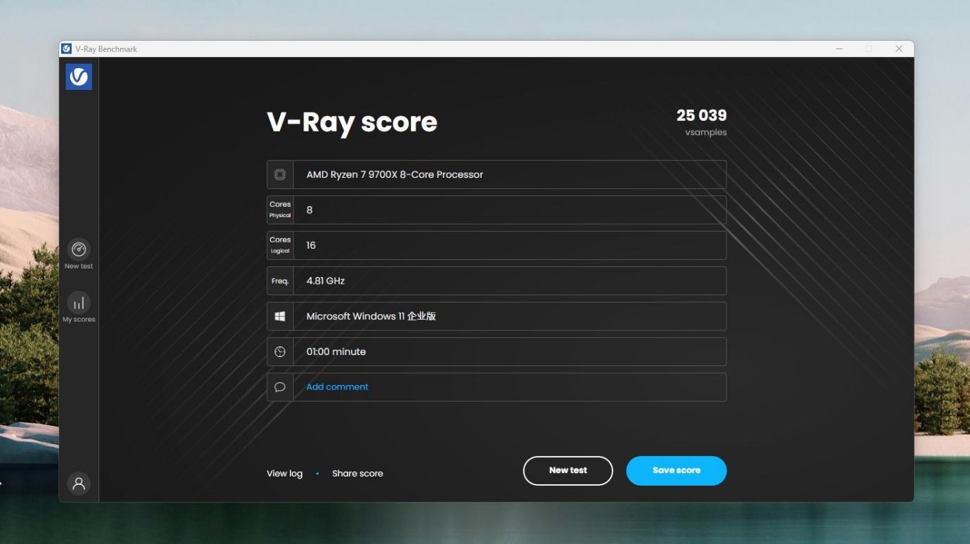 V-RAY CPU测试,跑分25039,之前是23001,提升明显。