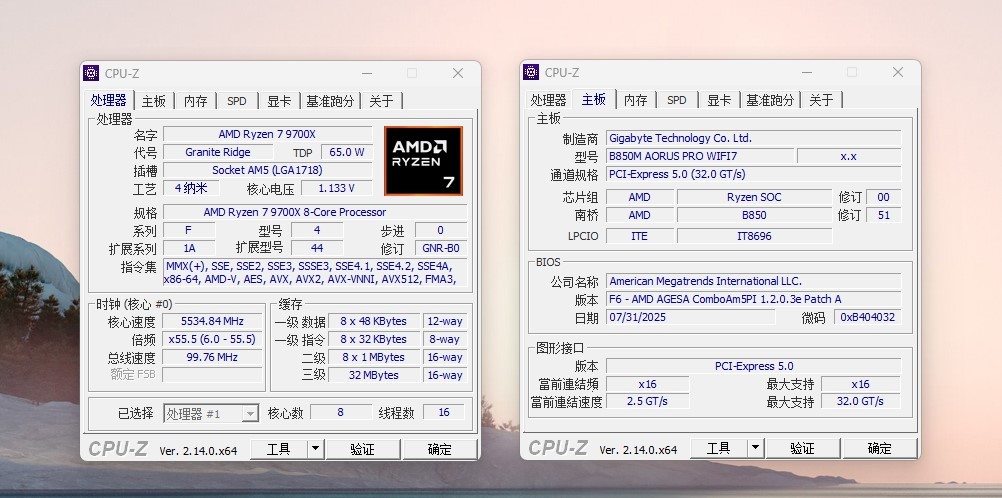 CPU-Z测试,正确显示配置,可以看到主板的通道规格和图形接口均是PCI-E 5.0。