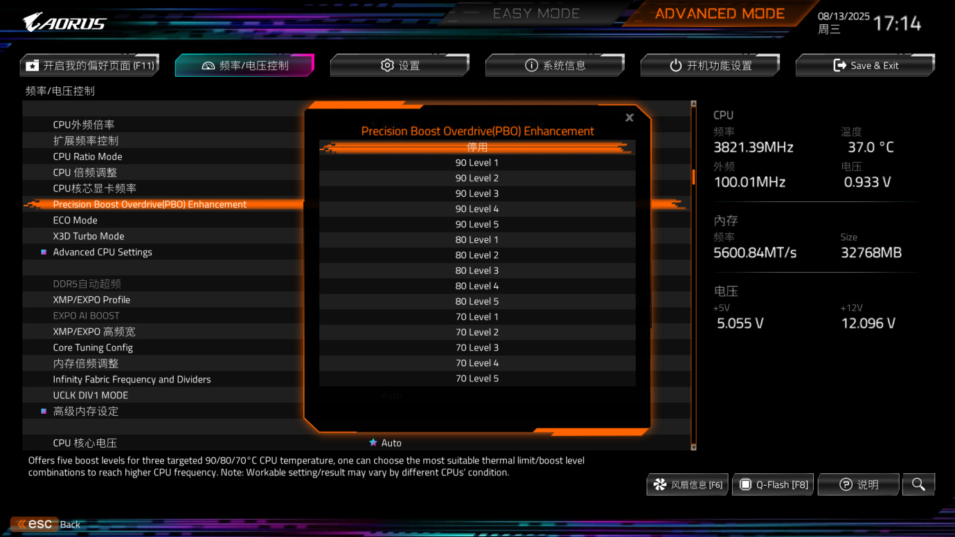 然后到这频率页面,有个PBO增强选项,打开后默认是停用的,我们可以一键选择其中一个模式。前面的数字代表温度上限,后面代表降压等级。