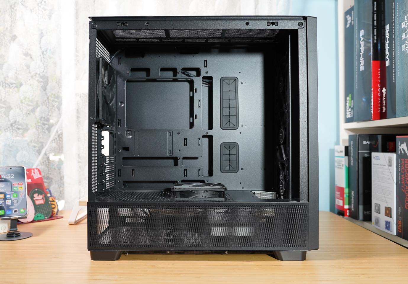 玻璃侧透是磁吸的,可以轻松取下,看到前面板里面,预装了3个120mm大风扇。前面板可以支持最大420mm水冷或者3个140mm风扇,相当富裕。电源仓顶部和侧面均是布满了散热孔,最大支持2个140mm风扇的安装,预装了一个120mm风扇。机箱后部,预装了一个140mm风扇,可以看到机箱支持最大支持E-ATX主板,包括ATX、M-ATX、ITX主板,同时也支持ATX、M-ATX背插主板。