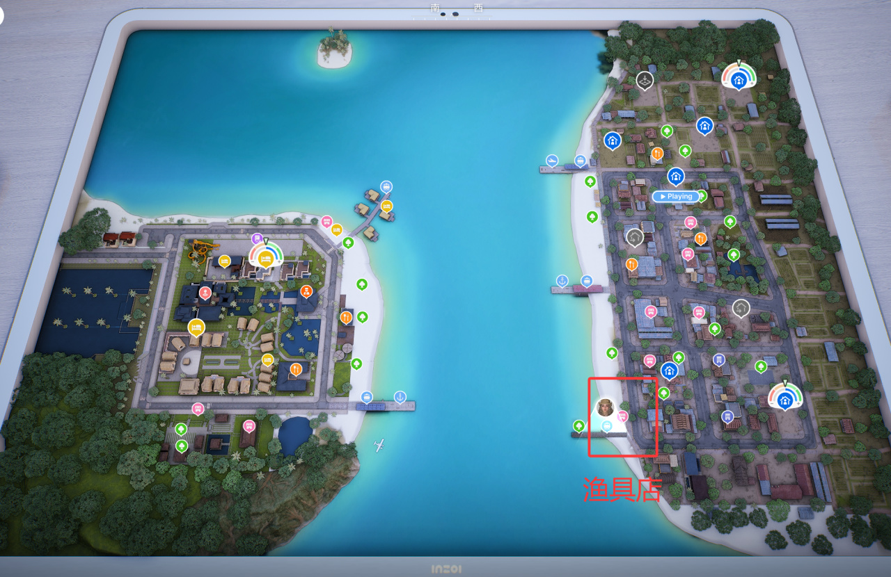 當我們打開地圖之後,以主島嶼爲例子,在我們如圖所示中框選出來的位置裏面,是有一家漁具店的,實際跑下來其他地方商店沒有漁具出售以及沿海岸邊上也沒有漁具售賣
