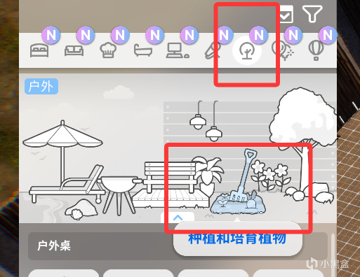 然後在傢俱一欄下面選擇如圖所框選的戶外選項,然後在點擊下方一個土堆+一個叉子的組合圖標便能夠直接跳轉到對應的的界面