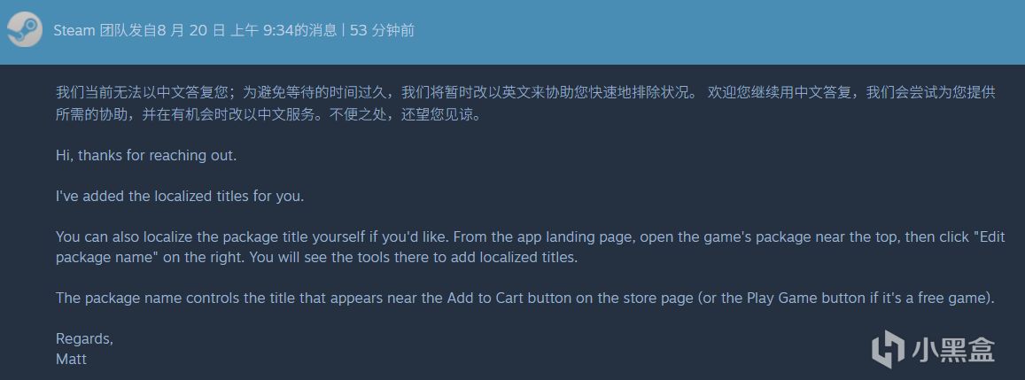 因爲趕在了週末,所以今天早上Steam客服纔回復了我們。