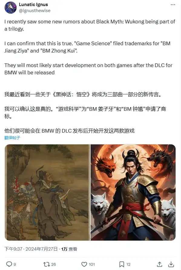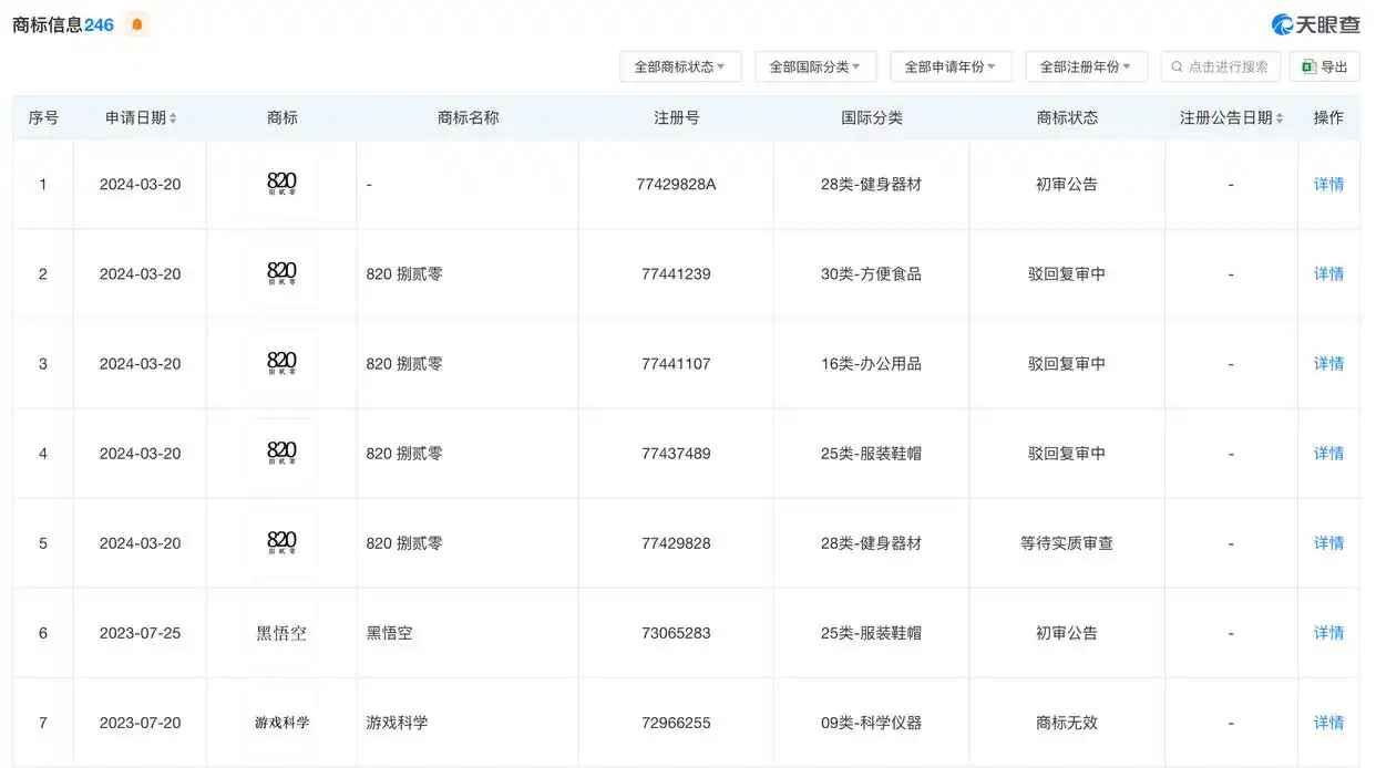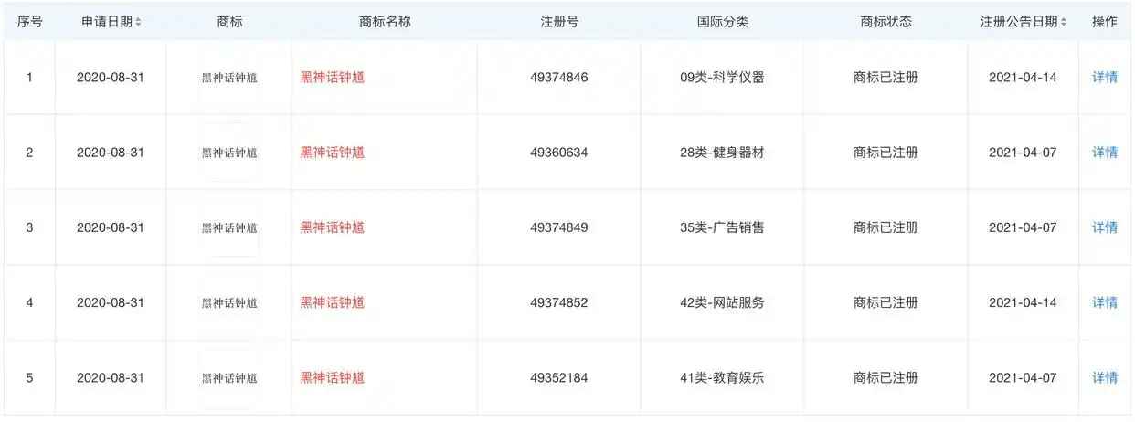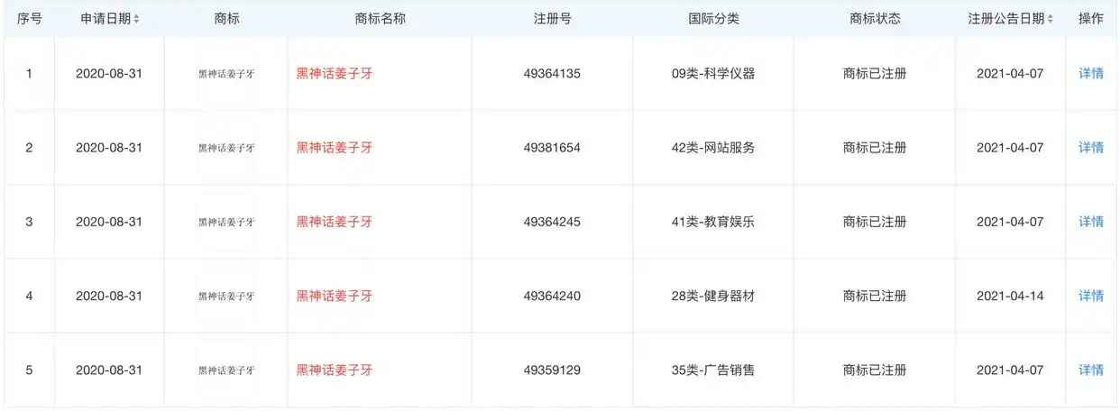 游戏科学团队的关联公司为深圳市游科互动科技有限公司,早年申请注册多枚“黑神话悟空”“黑悟空”“黑神话”“820 捌贰零”“黑神话·山海”“黑神话·大荒”等商标,商标状态多为已注册,其中包括多枚“黑神话姜子牙”“黑神话钟馗”商标。这或是《黑神话》系列的三部曲。