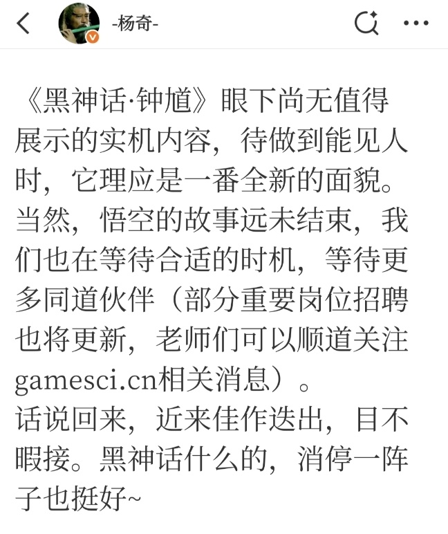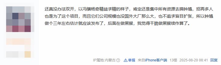 玩家们解读为暗示团队不愿同时开发《黑神话:悟空》的DLC和新作《钟馗》,以避免分散资源。这一观点在社区中迅速传播,部分玩家认可游戏科学规模有限,无法多线并行;