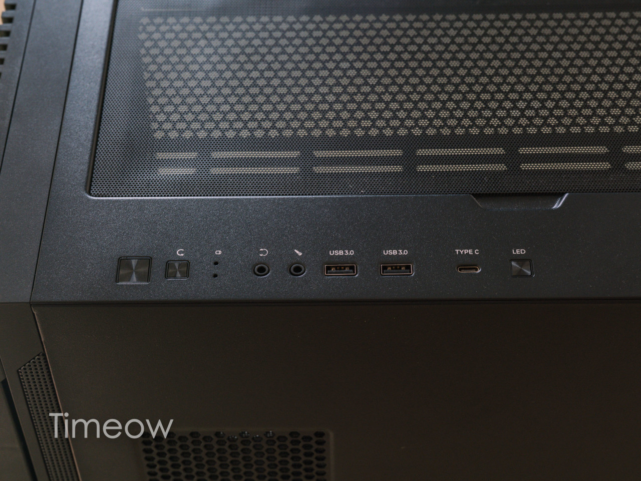 同時,這裏還有豐富的接口、按鈕和指示燈:包含開即鍵、重啓RESET鍵、硬盤指示燈、耳機和麥克風接口、兩個USB3.0接口、一個10Gbps的USB Type-C接口和一個LED切換鍵。隨手接個外設、移動硬盤還是相當方便且高速的。
