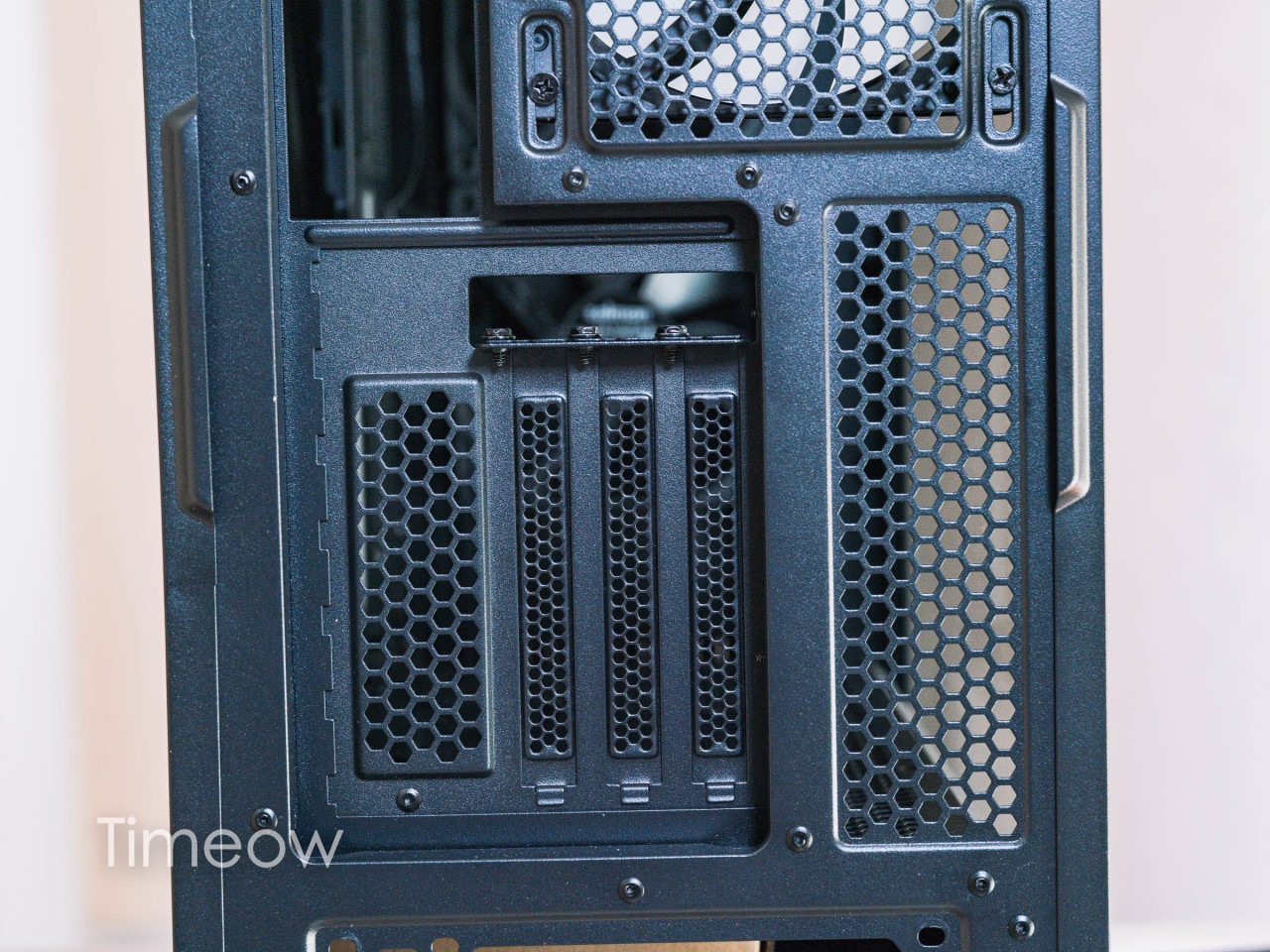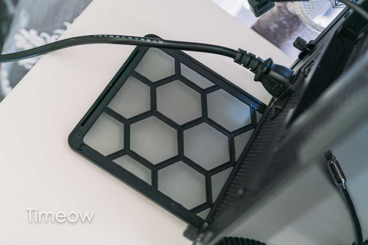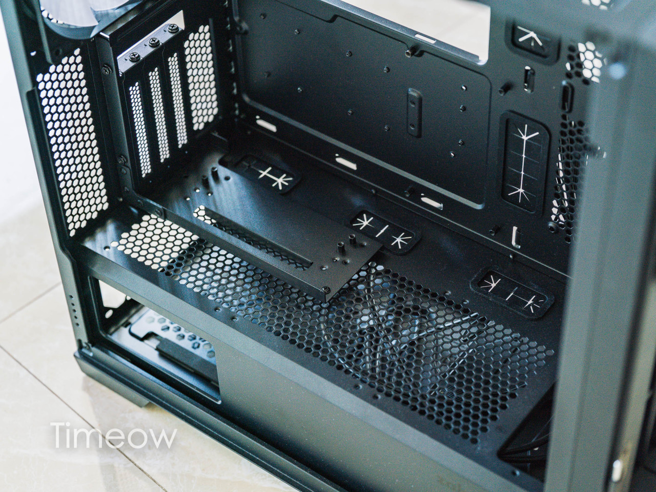 機箱背部有着非常密集的鏤空,一定程度上提升了散熱性能,同時也預留了線材凹槽,在插上插頭後不至於讓插頭顯得過於突出。
