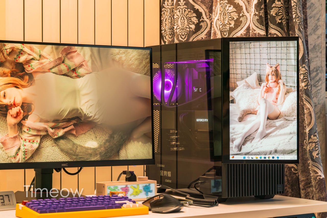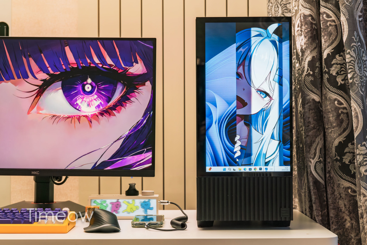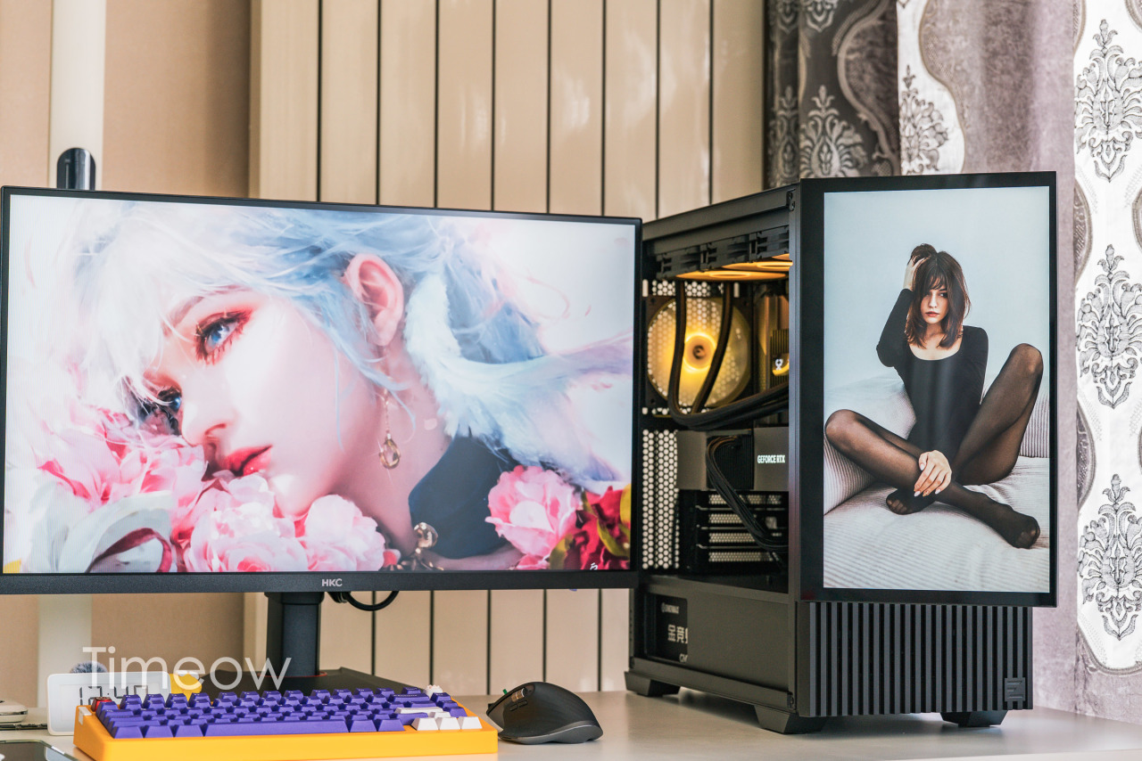 將包裝隨附的屏幕面板對準轉軸插入,接上機箱預埋的Type-C(供電)和Mini HDMI(信號),機箱前臉秒變顯示器。