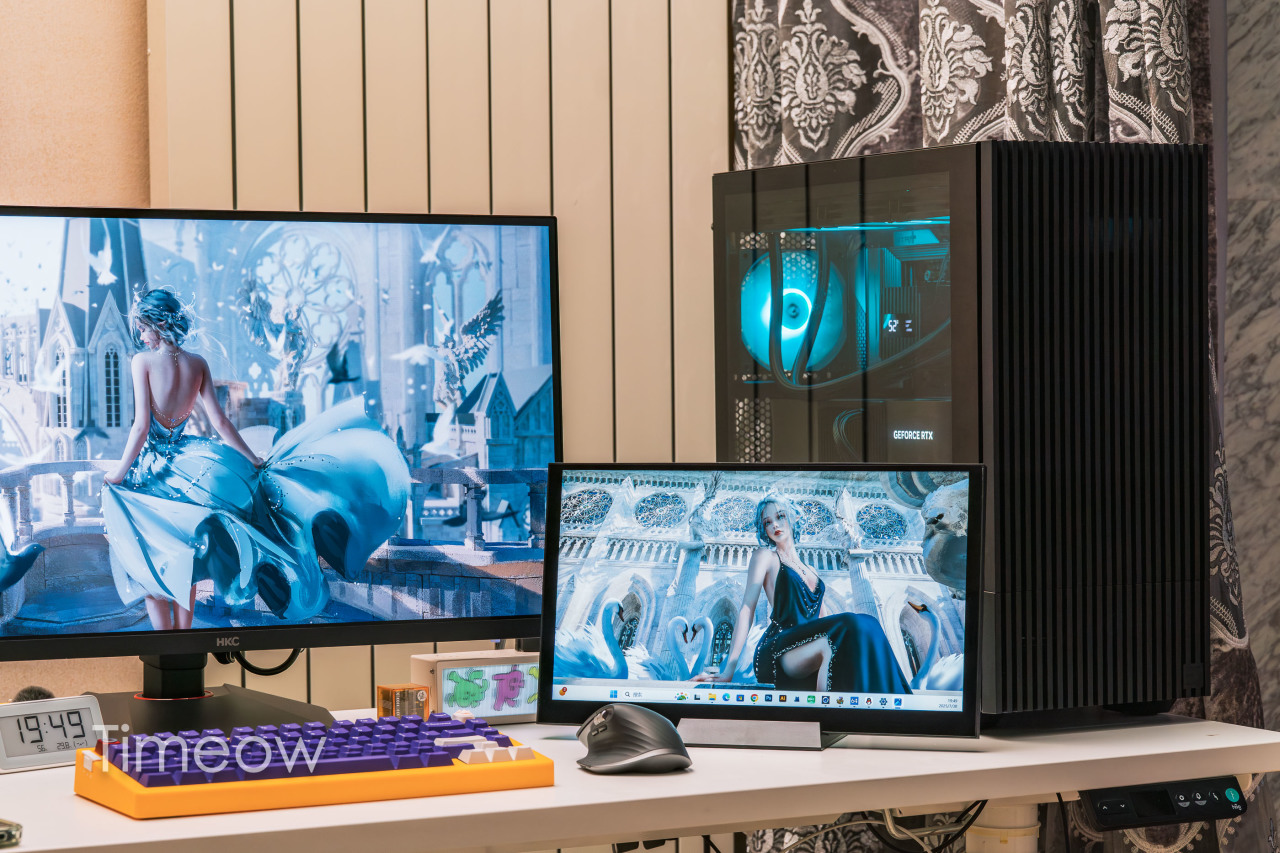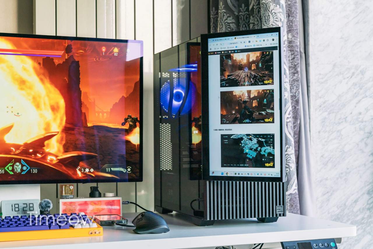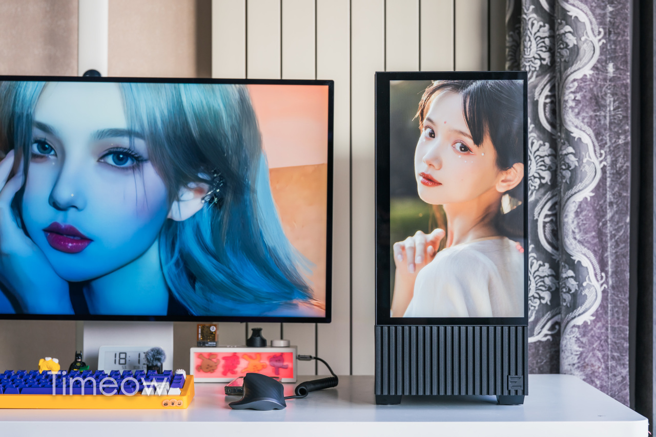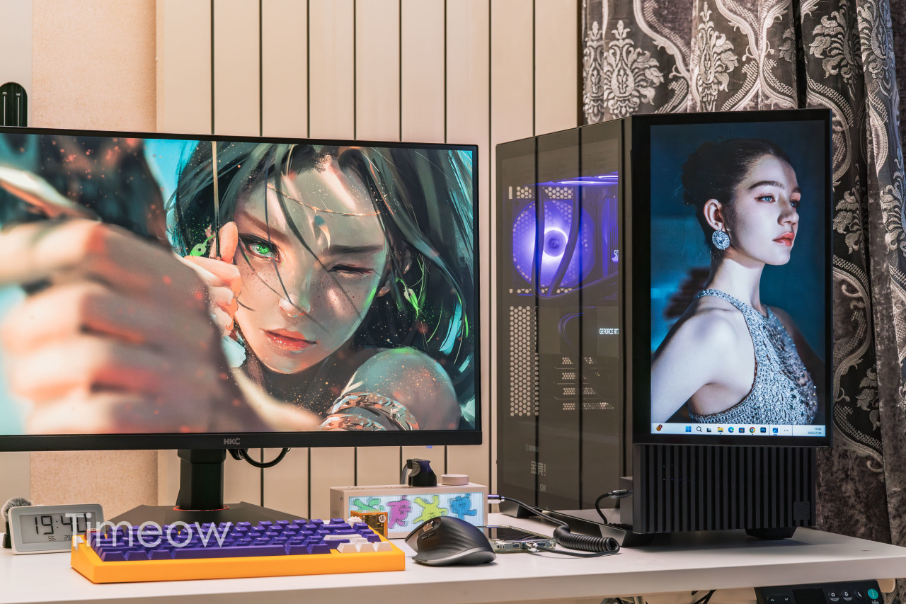 將包裝隨附的屏幕面板對準轉軸插入,接上機箱預埋的Type-C(供電)和Mini HDMI(信號),機箱前臉秒變顯示器。