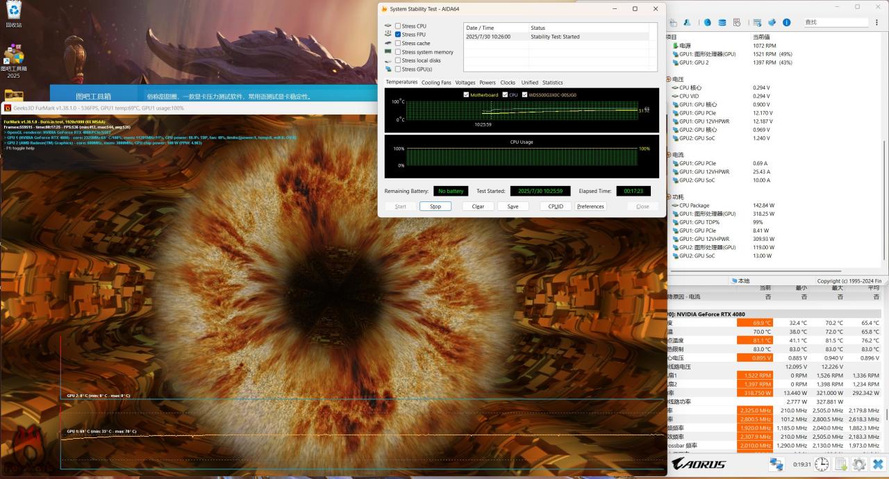 我用AIDA64的FPU+FurMark雙烤跑滿CPU和GPU,19分鐘的測試過程中,基本穩定在100%負載。
