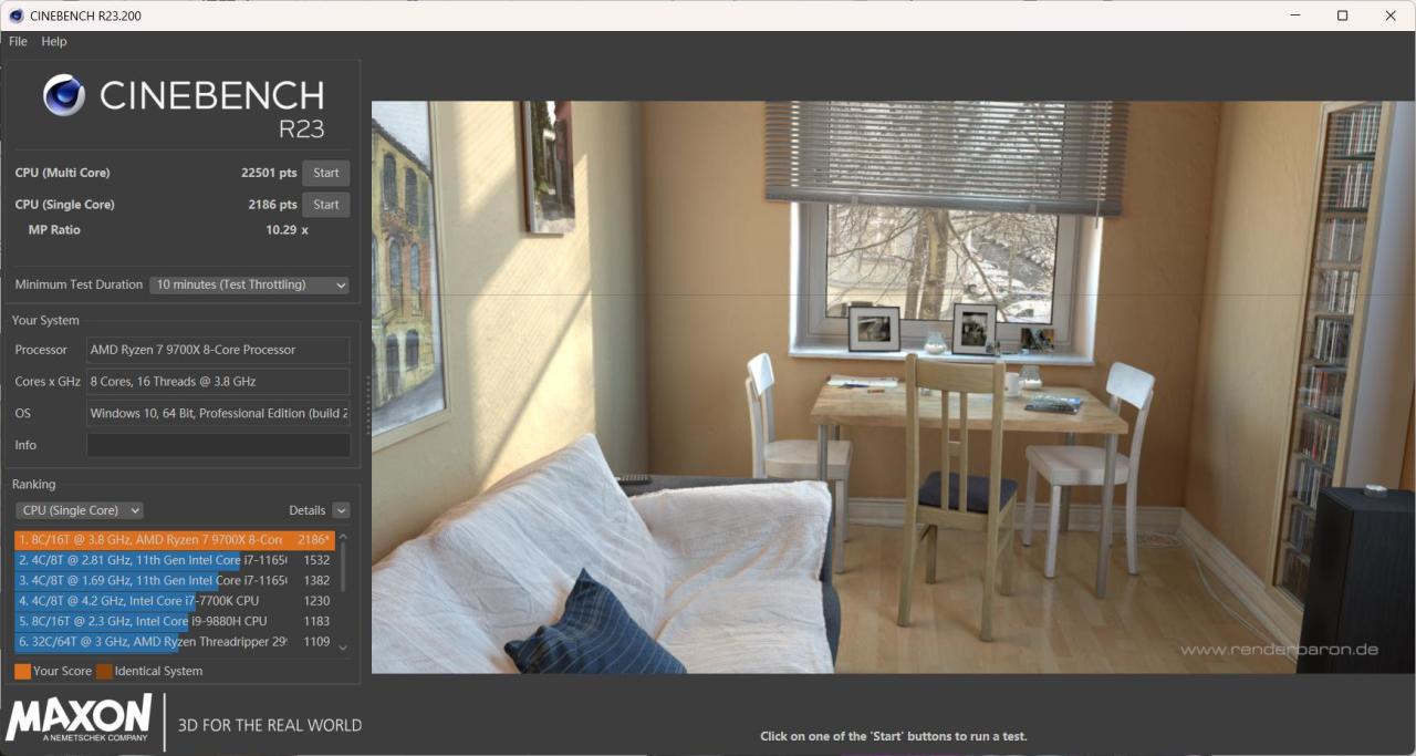 在Cinebench跑分中,單核跑分2186,多核跑分22501的成績也符合140W功耗時9700X的應有水平。
