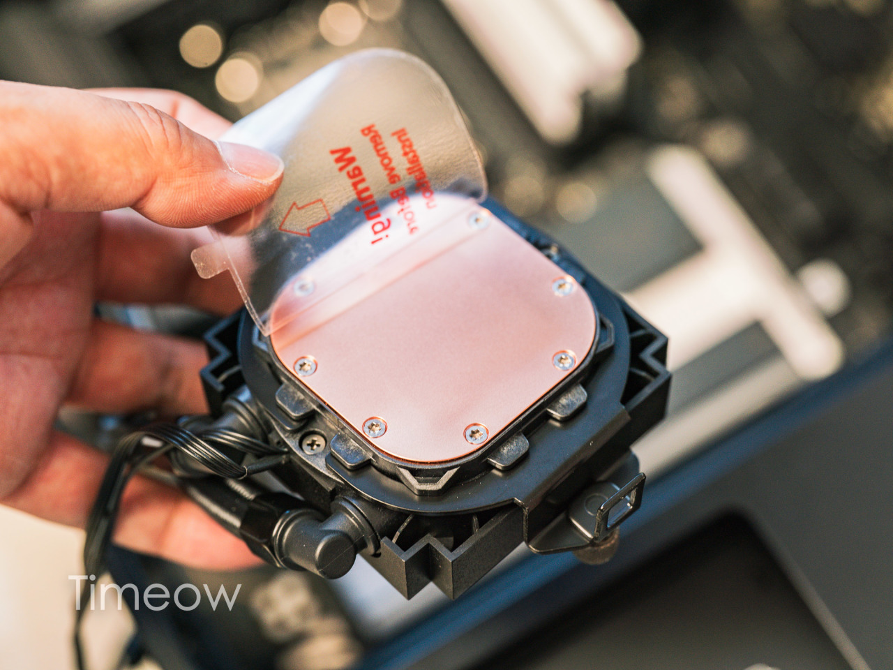 ZALMAN思民 阿爾法ALPHA2 A36 360的冷頭底部是純銅底座,打磨得非常光滑,接觸CPU時肯定嚴絲合縫,導熱差不了。官方說裏面藏了個3300轉水泵,配合超精密微水道,這導熱效率確實有點東西。