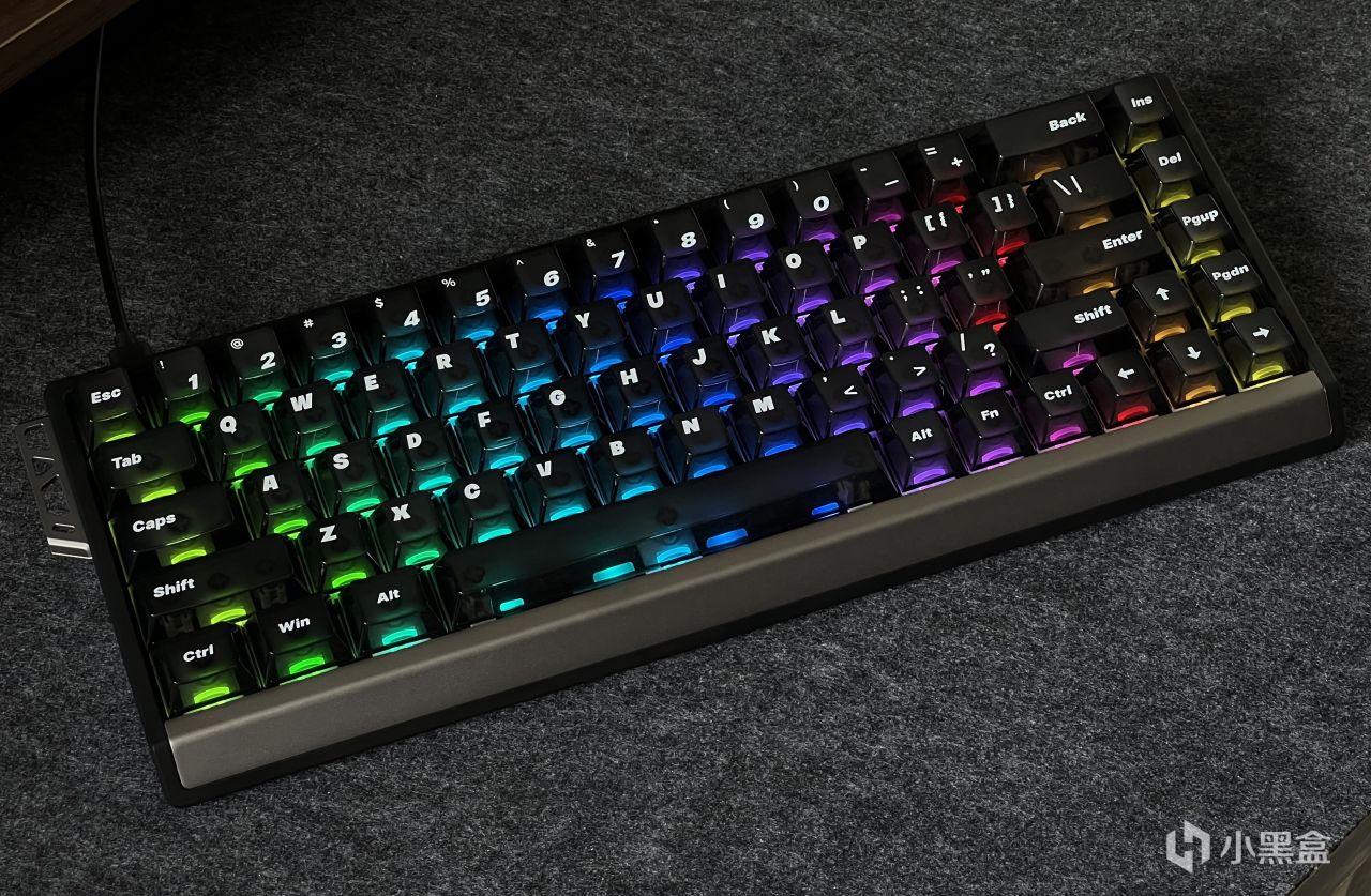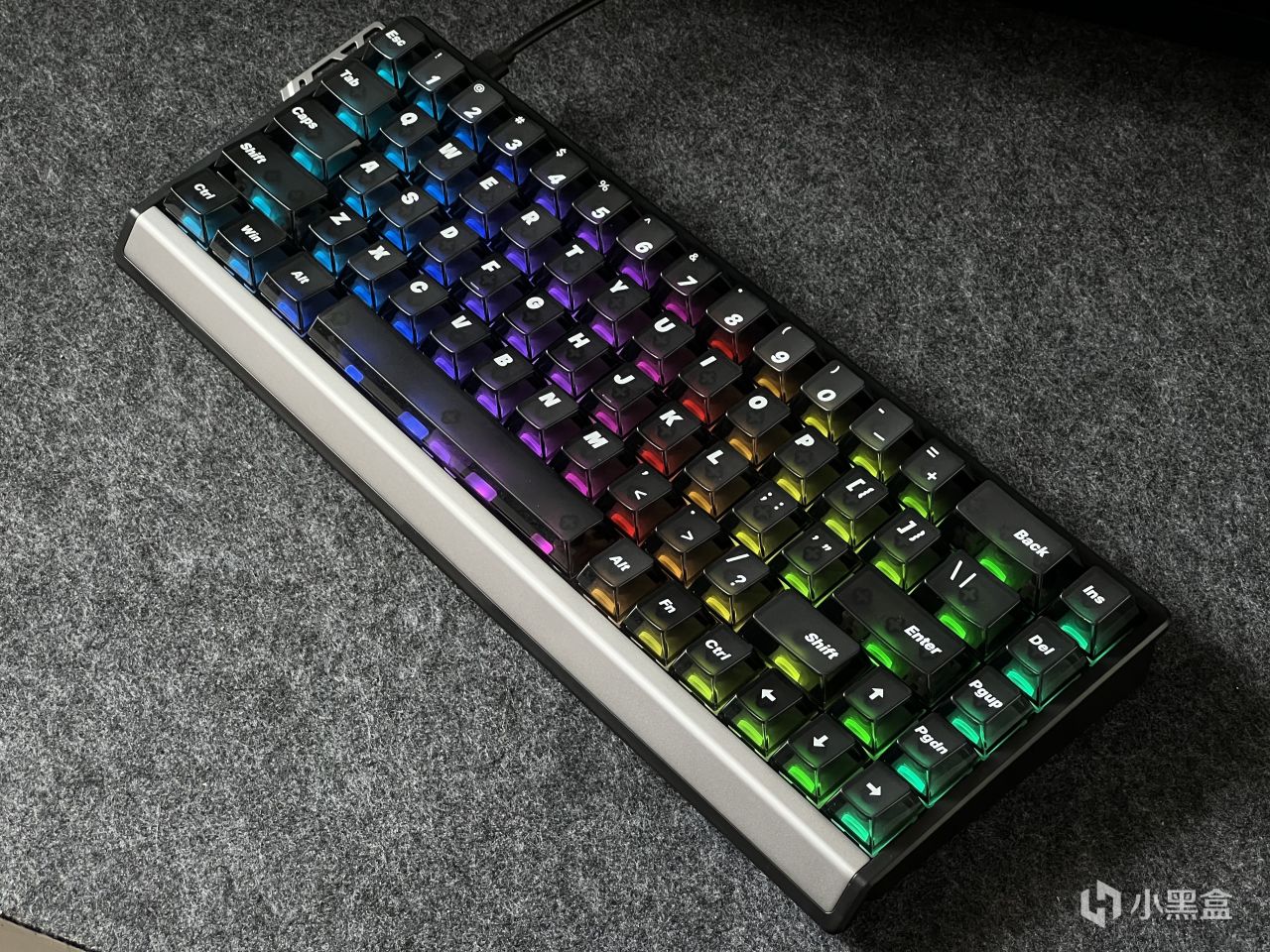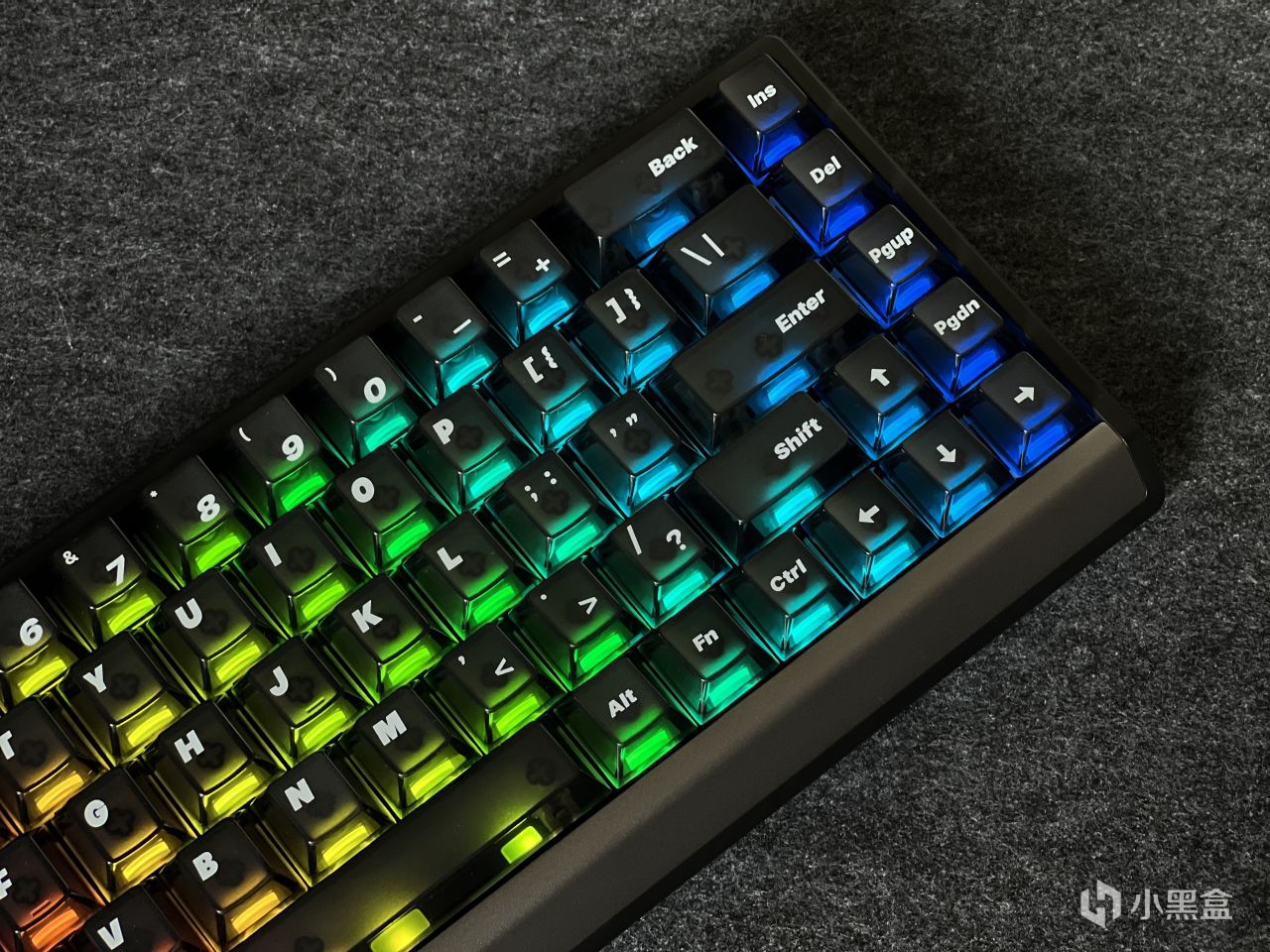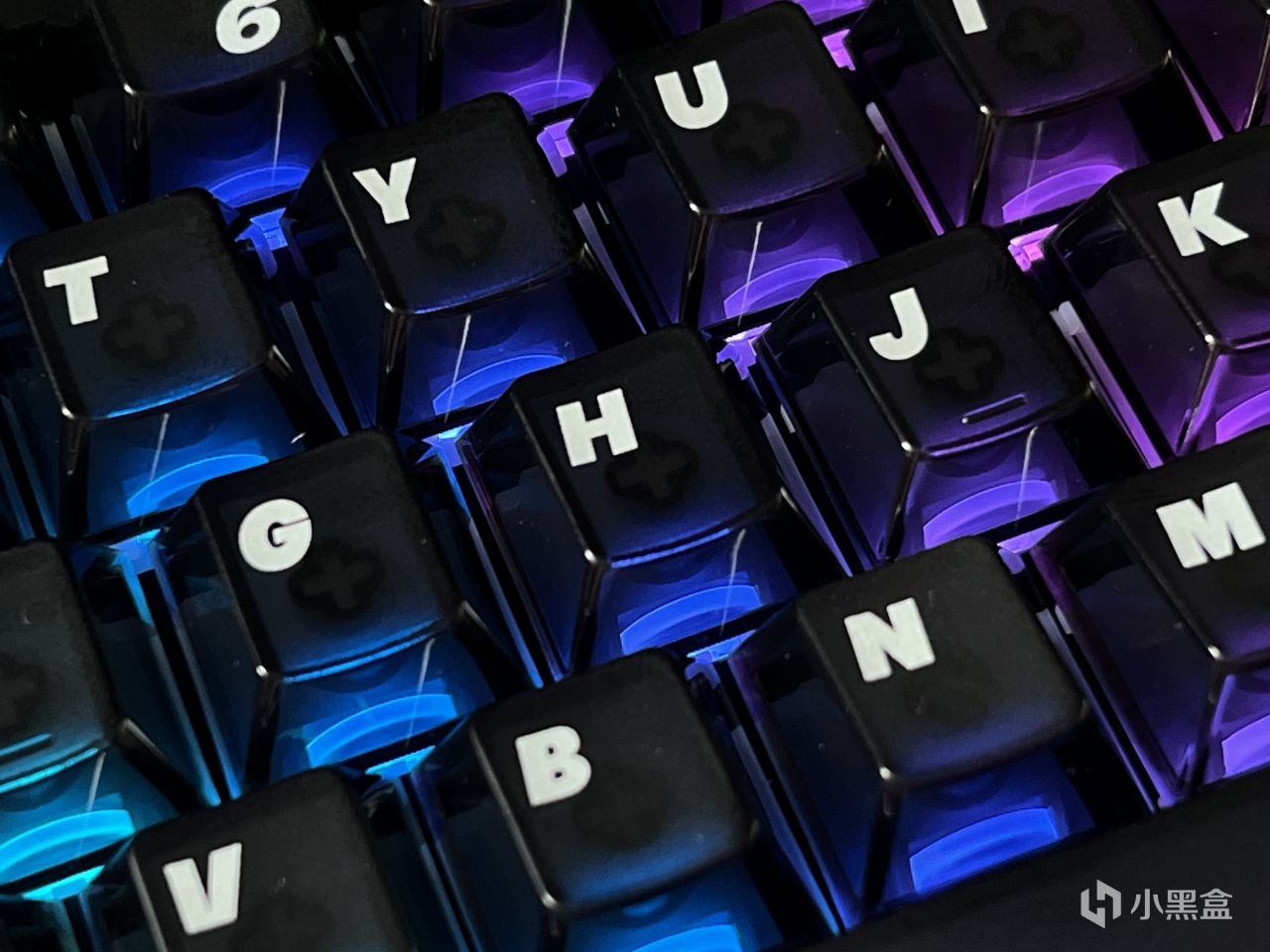 其次是这个大字符加上表面雾透、侧面透明的键帽,使得开了灯之后整把键盘不仅灯光表现巨好看,而且字符看的清楚的同时还不刺眼。