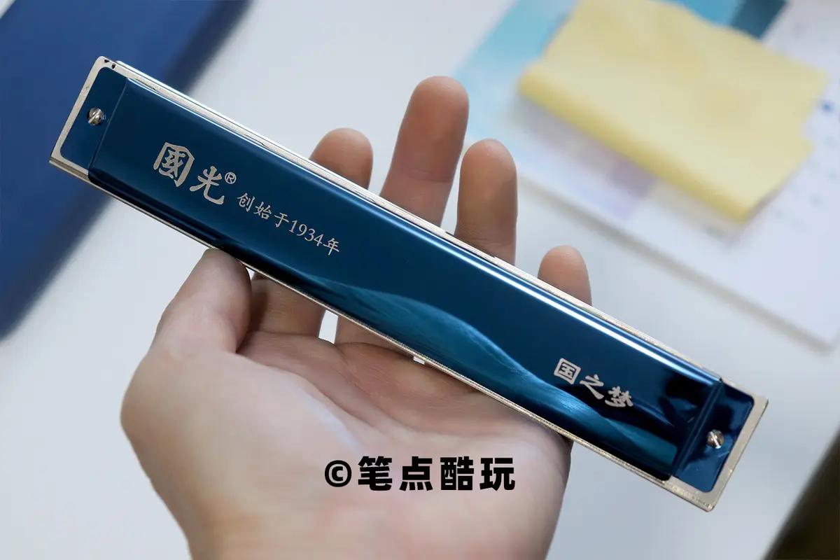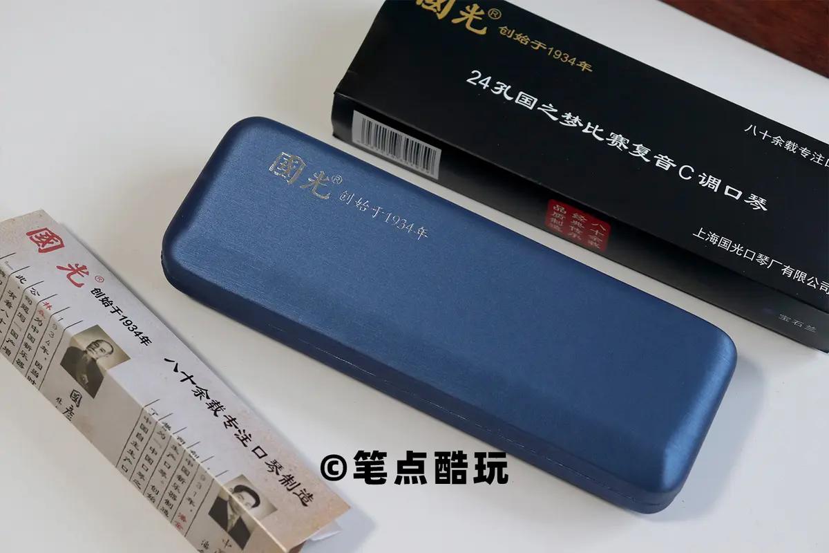 对了,文中这几张图都是我实拍,也是上次我给网友晒的礼物实拍图——几年前我在京东挑选的这款上海国光24孔国之梦比赛复音C调口琴,宝石兰的配色,包装也蛮有礼盒风,送给我老爸做个小礼物。
