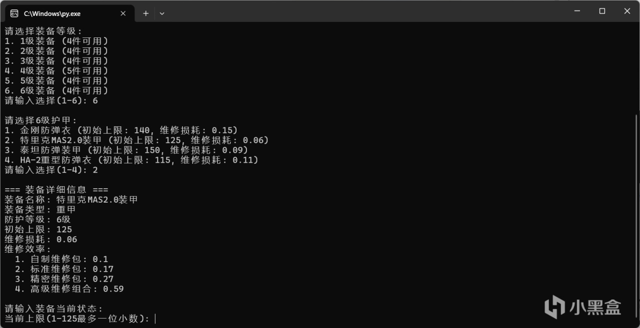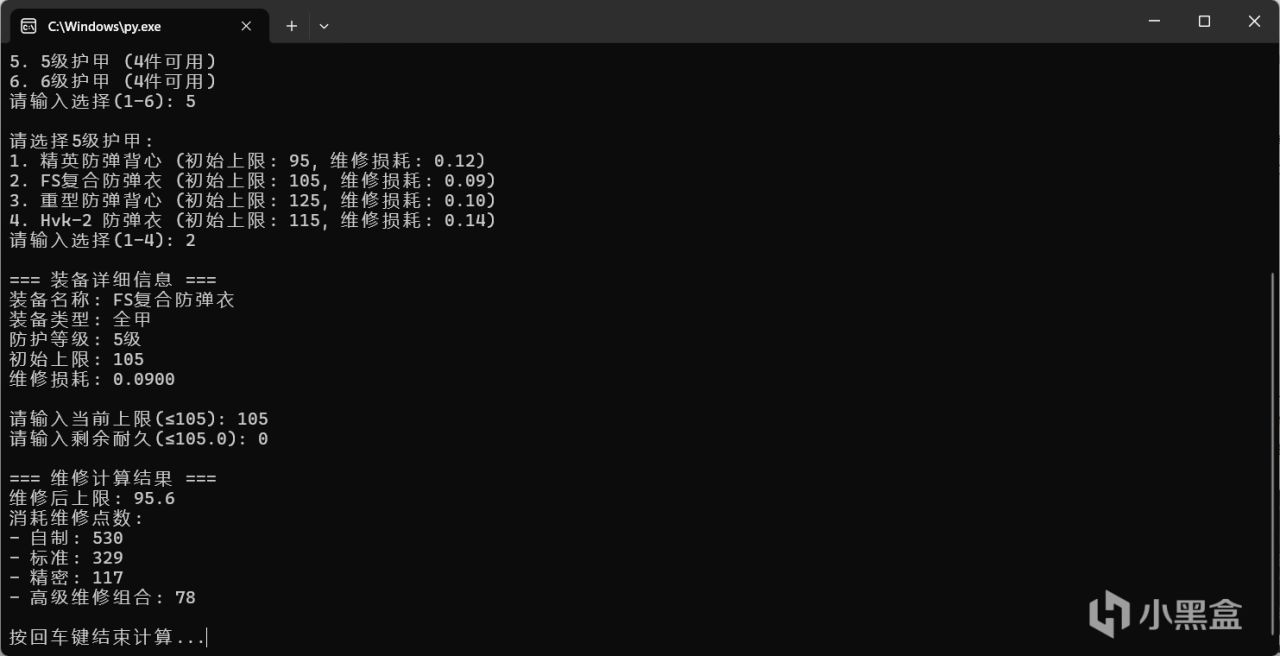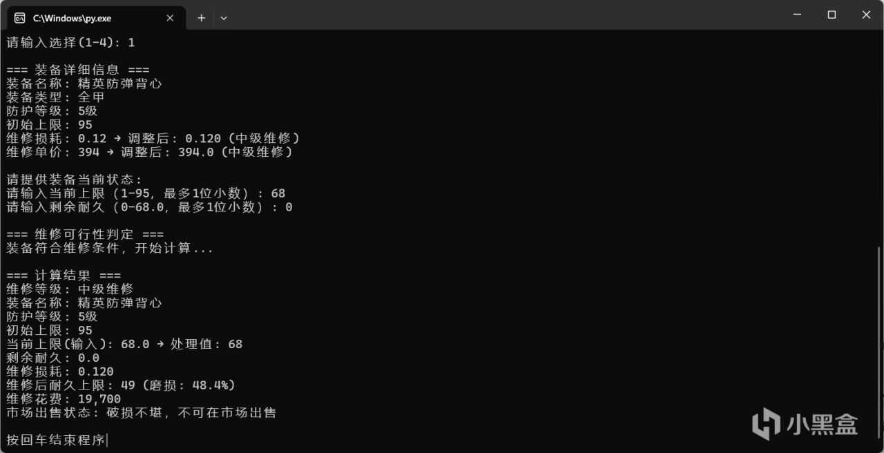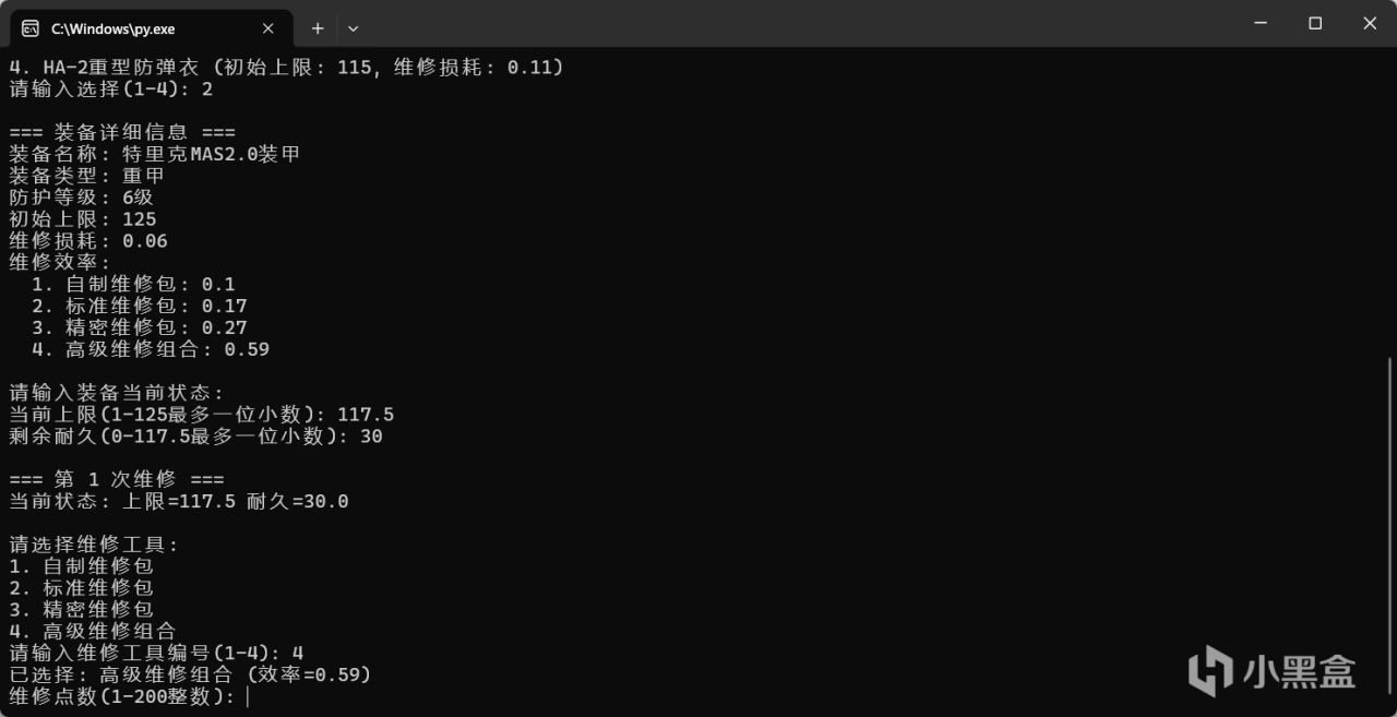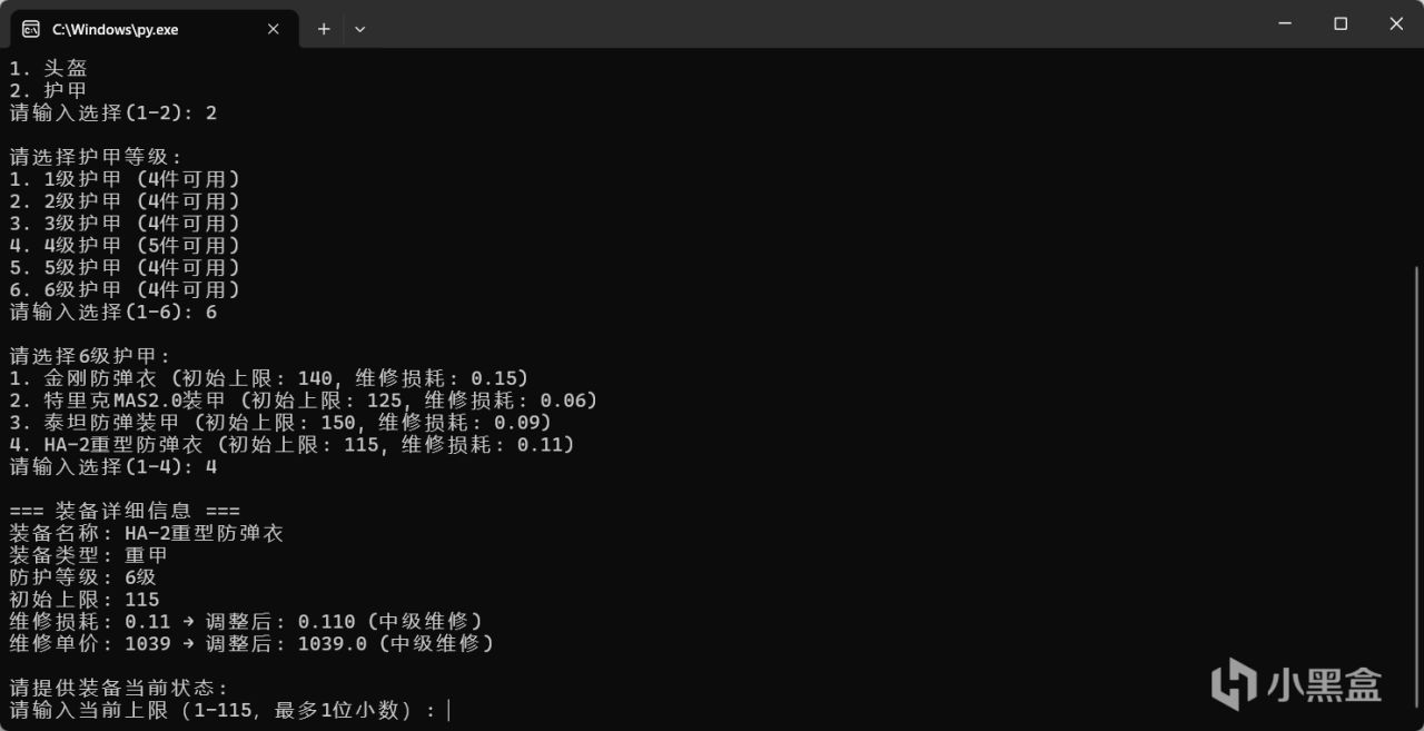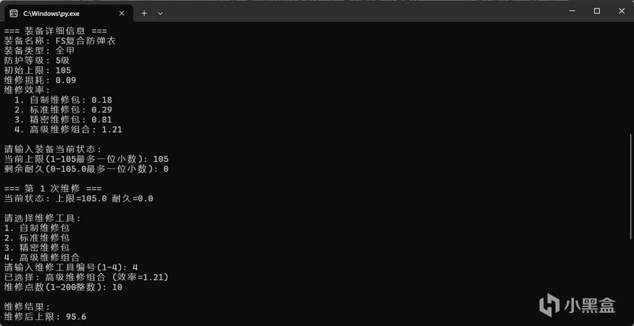 即用戶輸入護甲信息後,一次性將局內維修的消耗,與局外維修的價格,是否可以維修,這些信息一次全部輸出