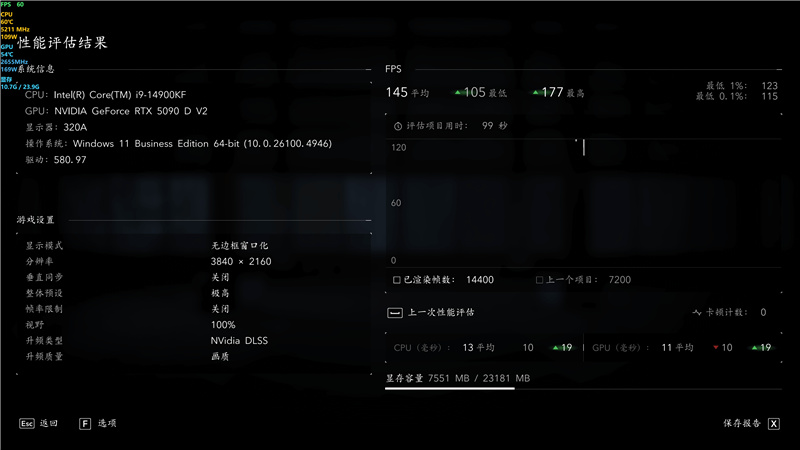 在《刺客信条:影》中,使用4K分辨率和极高画质测试进行测试,打开DLSS帧生成功能,测试成绩为145fps。