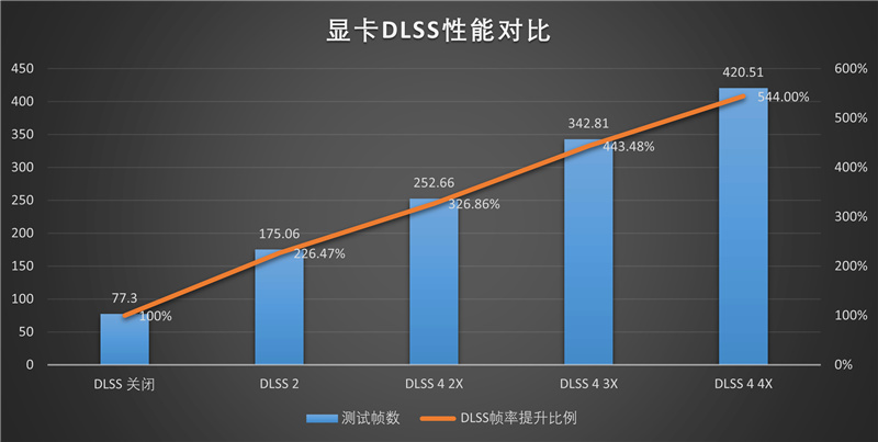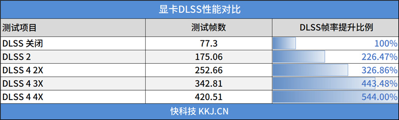 在3Dmark NVIDIA DLSS功能测试中,关闭DLSS 4时帧数为77.3FPS左右,开启DLSS 4 2x之后帧数上升为252.66FPS,开启DLSS 4 3x之后帧数上升为342.81FPS,开启DLSS 4 4x之后帧数上升为420.51FPS。