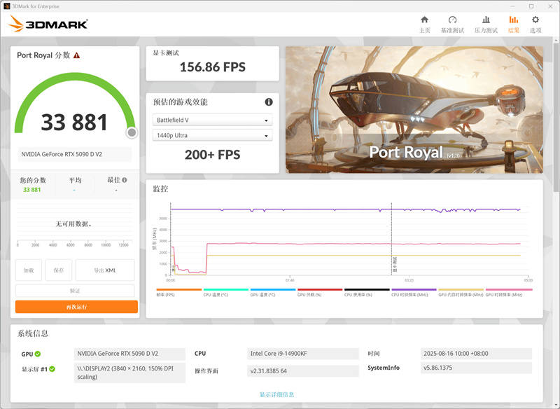 在3Dmark中测试实时光追性能的Prot Royal测试中,总成绩为33881,其中显卡测试成绩为156.86FPS。