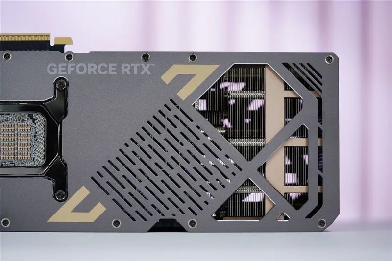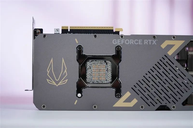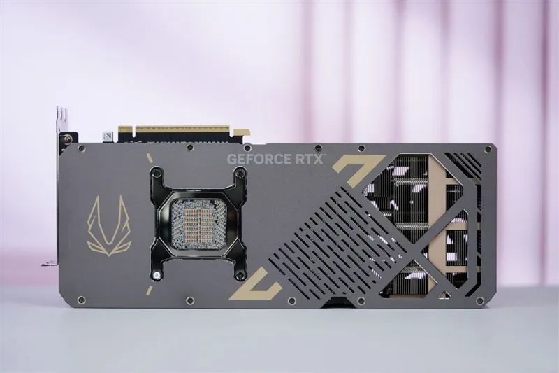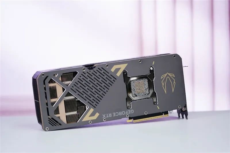 索泰RTX 5090 D v2 24GB SOLID OC显卡的合金背板,高强度合金铸形而成,尾部有大面积散热镂空设计,背板上印有暗金色图案和Logo,和背板镂空处露出的暗金色合金中框颜色呼应。