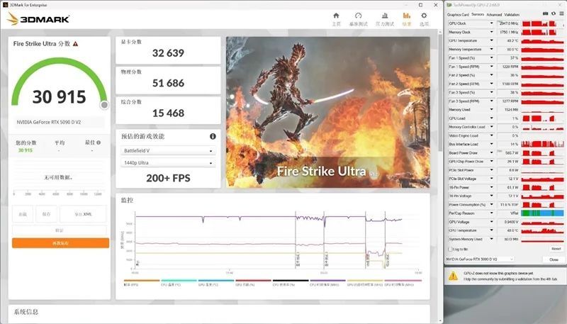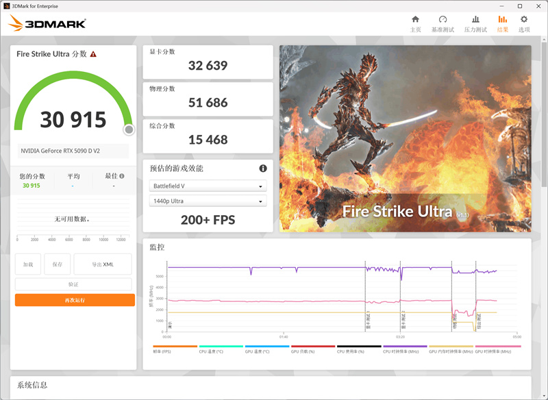 在3DMark的Fire Strike Ultra(DX11+4K渲染分辨率)测试中,总成绩为30915,其中显卡分数为32639。
