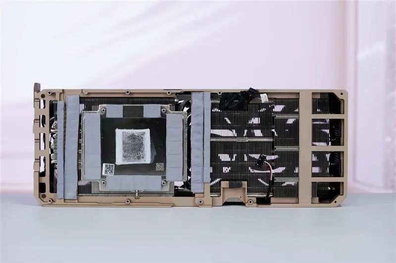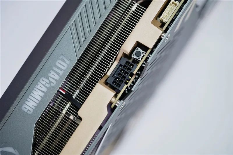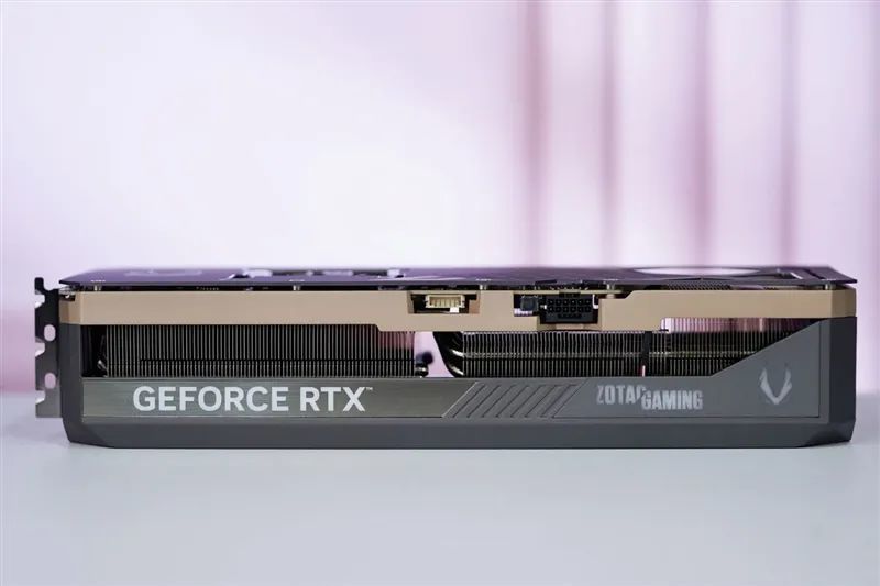 索泰RTX 5090 D v2 24GB SOLID OC显卡顶部设计有前后贯通的大型开口,可以很清楚的看到暗金色的合金中框,具有超强的抗扭抗压能力,提升显卡整体结构强度,防止显卡变形。