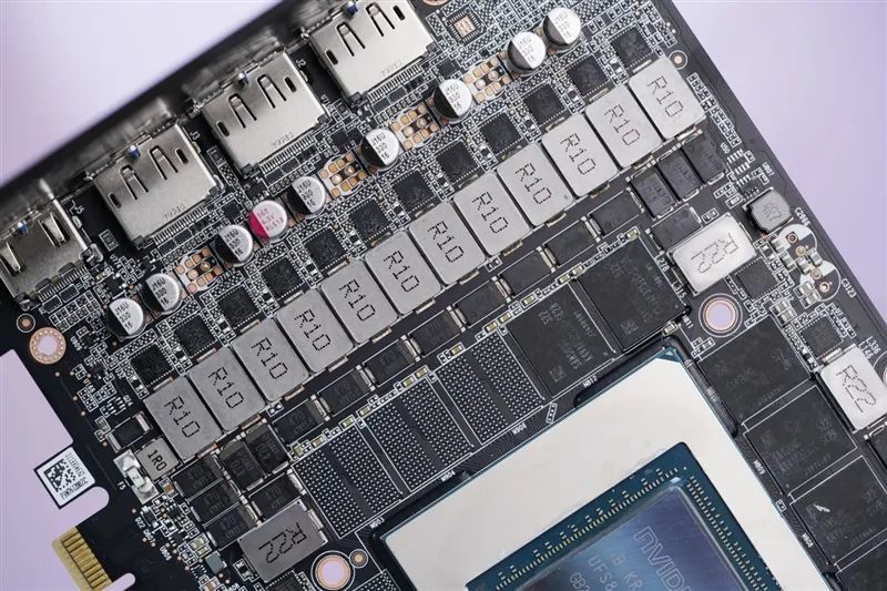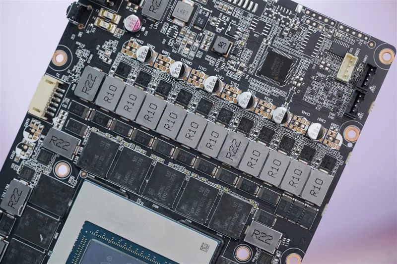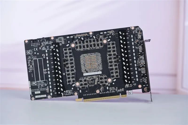 索泰RTX 5090 D v2 24GB SOLID OC显卡的PCB全貌,可以看到单面设计的PCB主要元件都集中在正面,背面十分干净,豪华的供电元件铺满整个PCB,没有留下一点空隙。