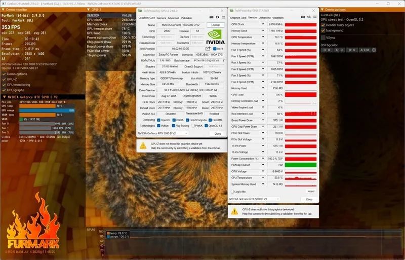 我们使用Furmark对索泰RTX 5090 D v2 24GB SOLID OC显卡进行10分钟的烤机,室温约28度,GPU功耗稳定在575W,核心频率2460MHz,温度78.1度,风扇转速1800-2200RPM,基本听不到噪音。