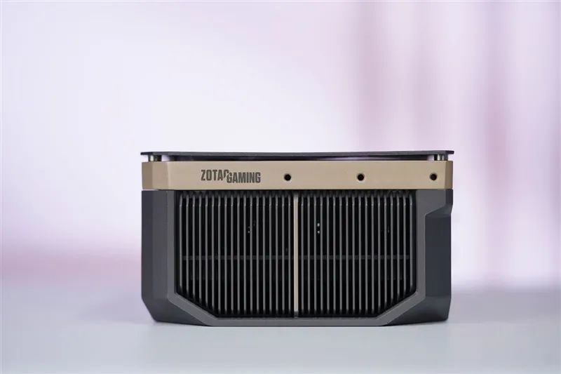 索泰RTX 5090 D v2 24GB SOLID OC显卡依旧使用了SOLID系列标志性的散热器,硬朗的工业风设计,垂直交错的线条和切角设计工业感十足,三枚95mm直径风扇几乎占满整个正面。