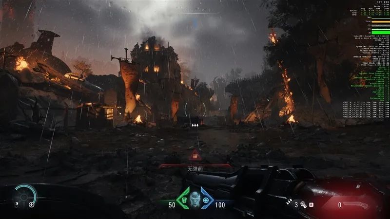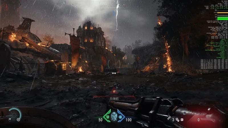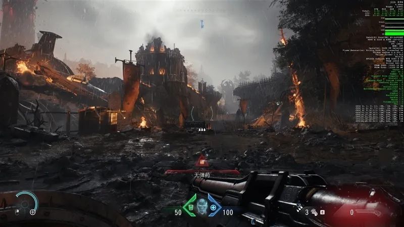 之后我们手动打开《毁灭战士:黑暗时代》中最新的路径追踪功能,测试超级噩梦性能指标下开启DLSS 4的帧数表现。