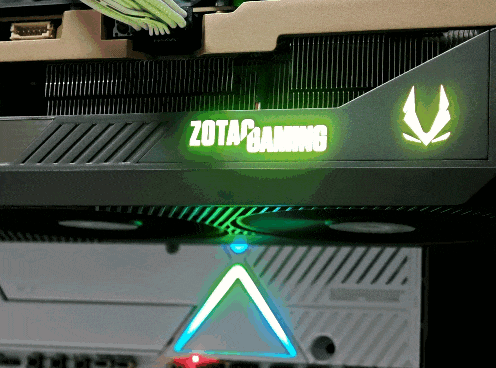 索泰RTX 5090 D v2 24GB SOLID OC显卡顶部Logo灯特写。
