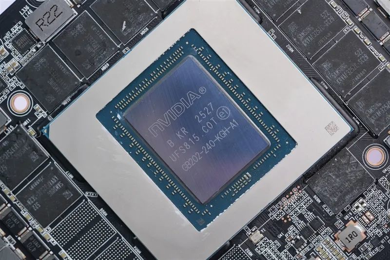 索泰RTX 5090 D v2 24GB SOLID OC显卡的GPU芯片特写,核心代号为GB202-240。