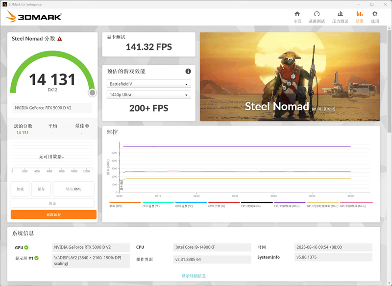 在3Dmark中测试可靠性、稳定性和持续性能的Steel Nomad测试中,总成绩为14131,其中显卡测试成绩为141.32FPS。