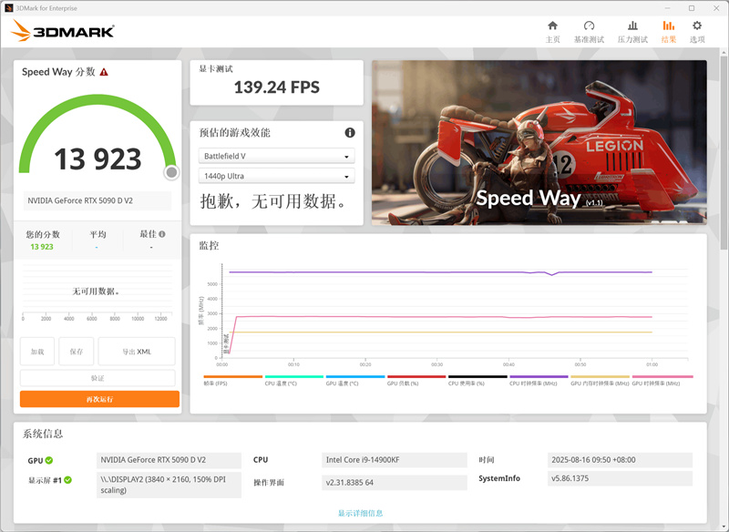 在3DMark测试综合性能的Speed Way测试中,总成绩为13923,其中显卡测试成绩为139.24FPS。