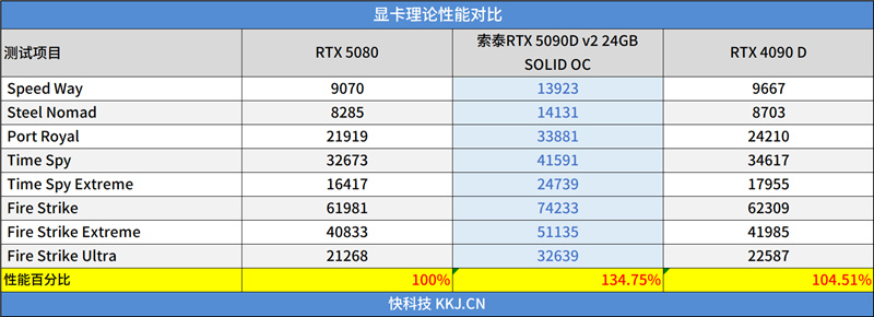 在3Dmark理论性能测试中,索泰RTX 5090 D v2 24GB SOLID OC显卡相比上代旗舰RTX 4090 D平均有36%的性能优势,面对次旗舰的RTX 5080,领先优势甚至有44%之巨,依旧是一览众山小。
