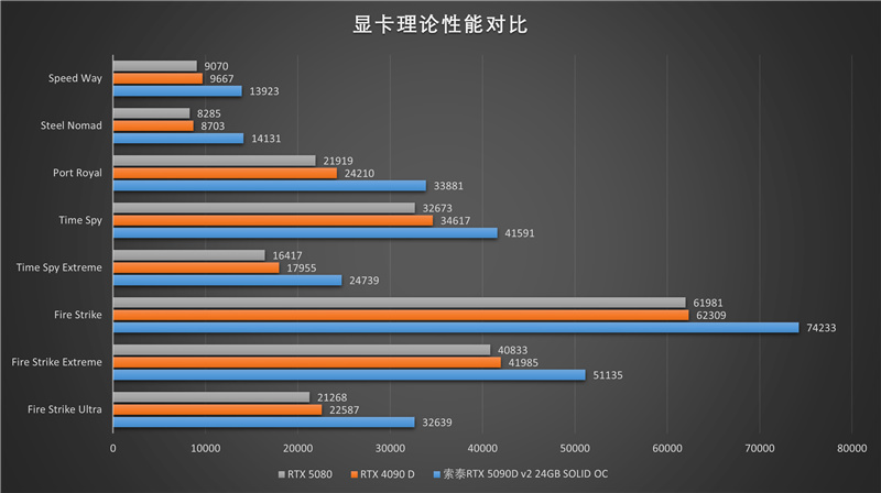 索泰RTX 5090 D v2 24GB SOLID OC显卡在3Dmark测试中依旧断崖式领先,对RTX 5080 足有34%的优势,对上代旗舰优势同样巨大,旗舰地位不容撼动,追求性能的顶级发烧玩家依旧可以放心选择。