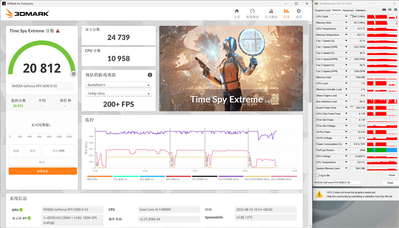 在3DMark的Time Spy Extreme(DX12+4K渲染分辨率)测试中,总成绩为20812,其中显卡分数为24739。