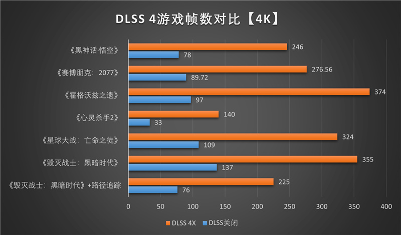 在《毁灭战士:黑暗时代》中,在开启DLSS 4最高的4X级别多帧生成时,在4K分辨率下的测试帧率为355。